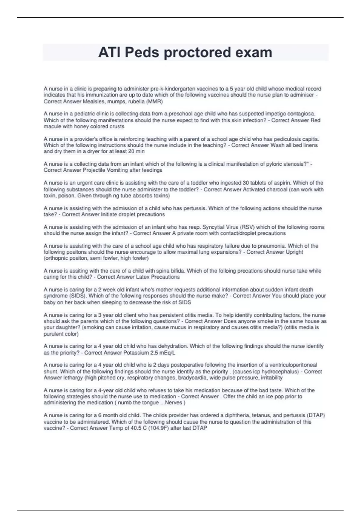 A nurse in a clinic is preparing to administer pre-k-kindergarten vaccines to a 5 year old child whose medical record indicates that his immunization are up to date which of the following vaccines should the nurse plan to adminiser - Correct Answer Mealsles, mumps, rubella (MMR) A nurse in a pediatric clinic is collecting data from a preschool age child who has suspected impetigo contagiosa. Which of the following manifestations should the nurse expect to find with this skin infection? - Correct Answer Red macule with honey colored crusts A nurse in a provider's office is reinforcing teaching with a parent of a school age child who has pediculosis capitis. Which of the following instructions should the nurse include in the teaching? - Correct Answer Wash all bed linens and dry them in a dryer for at least 20 min A nurse is a collecting data from an infant which of the following is a clinical manifestation of pyloric stenosis?" - Correct Answer Projectile Vomiting after feedings A nurse is an urgent care clinic is assisting with the care of a toddler who ingested 30 tablets of aspirin. Which of the following substances should the nurse administer to the toddler? - Correct Answer Activated charcoal (can work with toxin, poison. Given through ng tube absorbs toxins) A nurse is assisting with the admission of a child who has pertussis. Which of the following actions should the nurse take? - Correct Answer Initiate droplet precautions A nurse is assisting with the admission of an infant who has resp. Syncytial Virus (RSV) which of the following rooms should the nurse assign the infant? - Correct Answer A private room with contact/droplet precautions A nurse is assisting with the care of a school age child who has respiratory failure due to pneumonia. Which of the following positons should the nurse encourage to allow maximal lung expansions? - Correct Answer Upright (orthopnic positon, semi fowler, high fowler) A nurse is assiting with the care of a child with spina bifida. Which of the folloing precations should nurse take while caring for this child? - Correct Answer Latex Precautions A nurse is caring for a 2 week old infant who's mother requests additional information about sudden infant death syndrome (SIDS). Which of the following responses should the nurse make? - Correct Answer You should place your baby on her back when sleeping to decrease the risk of SIDS A nurse is caring for a 3 year old client who has persistent otitis media. To help identify contributing factors, the nurse should ask the parents which of the following questions? - Correct Answer Does anyone smoke in the same house as your daughter? (smoking can cause irritation, cause mucus in respiratory and causes otitis media?) (otitis media is purulent color) A nurse is caring for a 4 year old child who has dehydration. Which of the following findings should the nurse identify as the priority? - Correct Answer Potassium 2.5 mEq/L A nurse is caring for a 4 year old child who is 2 days postoperative following the insertion of a ventriculoperitoneal shunt. Which of the following findings should the nurse identify as the priority . (causes icp hydrocephalus) - Correct Answer lethargy (high pitched cry, respiratory changes, bradycardia, wide pulse pressure, irritability A nurse is caring for a 4-year old child who refuses to take his medication because of the bad taste. Which of the following strategies should the nurse use to medication - Correct Answer . Offer the child an ice pop prior to administering the medication ( numb the tongue ...Nerves ) A nurse is caring for a 6 month old child. The childs provider has ordered a diphtheria, tetanus, and pertussis (DTAP) vaccine to be administered. Which of the following should cause the nurse to question the administration of this vaccine? - Correct Answer Temp of 40.5 C (104.9F) after last DTAP