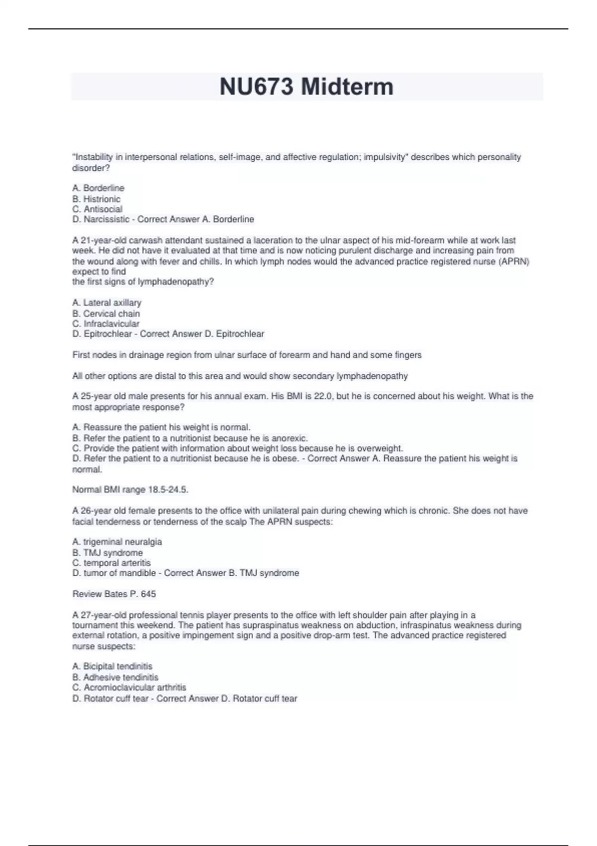 "Instability in interpersonal relations, self-image, and affective regulation; impulsivity" describes which personality disorder? A. Borderline B. Histrionic C. Antisocial D. Narcissistic - Correct Answer A. Borderline A 21-year-old carwash attendant sustained a laceration to the ulnar aspect of his mid-forearm while at work last week. He did not have it evaluated at that time and is now noticing purulent discharge and increasing pain from the wound along with fever and chills. In which lymph nodes would the advanced practice registered nurse (APRN) expect to find the first signs of lymphadenopathy? A. Lateral axillary B. Cervical chain C. Infraclavicular D. Epitrochlear - Correct Answer D. Epitrochlear First nodes in drainage region from ulnar surface of forearm and hand and some fingers All other options are distal to this area and would show secondary lymphadenopathy A 25-year old male presents for his annual exam. His BMI is 22.0, but he is concerned about his weight. What is the most appropriate response? A. Reassure the patient his weight is normal. B. Refer the patient to a nutritionist because he is anorexic. C. Provide the patient with information about weight loss because he is overweight. D. Refer the patient to a nutritionist because he is obese. - Correct Answer A. Reassure the patient his weight is normal. Normal BMI range 18.5-24.5. A 26-year old female presents to the office with unilateral pain during chewing which is chronic. She does not have facial tenderness or tenderness of the scalp The APRN suspects: A. trigeminal neuralgia B. TMJ syndrome C. temporal arteritis D. tumor of mandible - Correct Answer B. TMJ syndrome Review Bates P. 645 A 27-year-old professional tennis player presents to the office with left shoulder pain after playing in a tournament this weekend. The patient has supraspinatus weakness on abduction, infraspinatus weakness during external rotation, a positive impingement sign and a positive drop-arm test. The advanced practice registered nurse suspects: A. Bicipital tendinitis B. Adhesive tendinitis C. Acromioclavicular arthritis