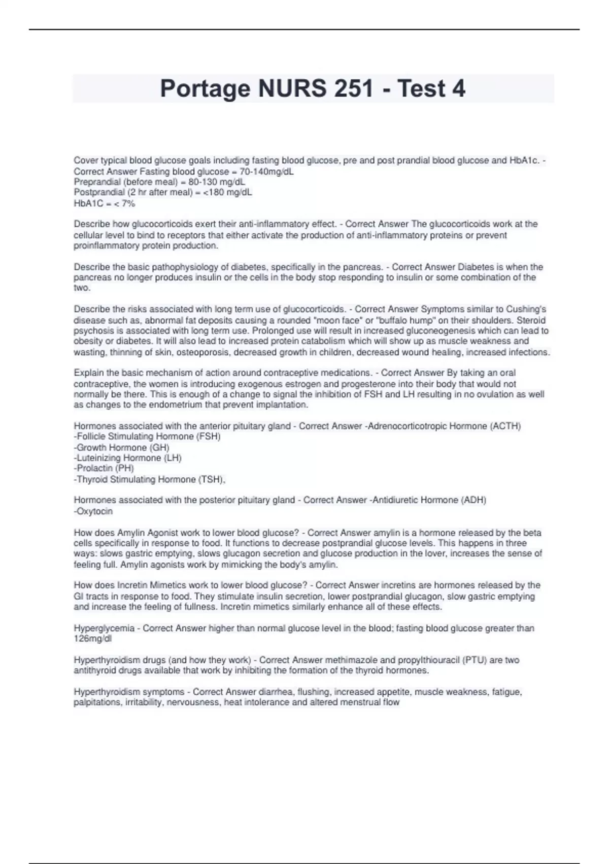 Cover typical blood glucose goals including fasting blood glucose, pre and post prandial blood glucose and HbA1c. - Correct Answer Fasting blood glucose = 70-140mg/dL Preprandial (before meal) = 80-130 mg/dL Postprandial (2 hr after meal) = 180 mg/dL HbA1C = 7% Describe how glucocorticoids exert their anti-inflammatory effect. - Correct Answer The glucocorticoids work at the cellular level to bind to receptors that either activate the production of anti-inflammatory proteins or prevent proinflammatory protein production. Describe the basic pathophysiology of diabetes, specifically in the pancreas. - Correct Answer Diabetes is when the pancreas no longer produces insulin or the cells in the body stop responding to insulin or some combination of the two. Describe the risks associated with long term use of glucocorticoids. - Correct Answer Symptoms similar to Cushing's disease such as, abnormal fat deposits causing a rounded "moon face" or "buffalo hump" on their shoulders. Steroid psychosis is associated with long term use. Prolonged use will result in increased gluconeogenesis which can lead to obesity or diabetes. It will also lead to increased protein catabolism which will show up as muscle weakness and wasting, thinning of skin, osteoporosis, decreased growth in children, decreased wound healing, increased infections. Explain the basic mechanism of action around contraceptive medications. - Correct Answer By taking an oral contraceptive, the women is introducing exogenous estrogen and progesterone into their body that would not normally be there. This is enough of a change to signal the inhibition of FSH and LH resulting in no ovulation as well as changes to the endometrium that prevent implantation. Hormones associated with the anterior pituitary gland - Correct Answer -Adrenocorticotropic Hormone (ACTH) -Follicle Stimulating Hormone (FSH) -Growth Hormone (GH) -Luteinizing Hormone (LH) -Prolactin (PH) -Thyroid Stimulating Hormone (TSH), Hormones associated with the posterior pituitary gland - Correct Answer -Antidiuretic Hormone (ADH) -Oxytocin How does Amylin Agonist work to lower blood glucose? - Correct Answer amylin is a hormone released by the beta cells specifically in response to food. It functions to decrease postprandial glucose levels. This happens in three ways: slows gastric emptying, slows glucagon secretion and glucose production in the lover, increases the sense of feeling full. Amylin agonists work by mimicking the body's amylin. How does Incretin Mimetics work to lower blood glucose? - Correct Answer incretins are hormones released by the GI tracts in response to food. They stimulate insulin secretion, lower postprandial glucagon, slow gastric emptying and increase the feeling of fullness. Incretin mimetics similarly enhance all of these effects. Hyperglycemia - Correct Answer higher than normal glucose level in the blood; fasting blood glucose greater than 126mg/dl Hyperthyroidism drugs (and how they work) - Correct Answer methimazole and propylthiouracil (PTU) are two antithyroid drugs available that work by inhibiting the formation of the thyroid hormones. Hyperthyroidism symptoms - Correct Answer diarrhea, flushing, increased appetite, muscle weakness, fatigue,
