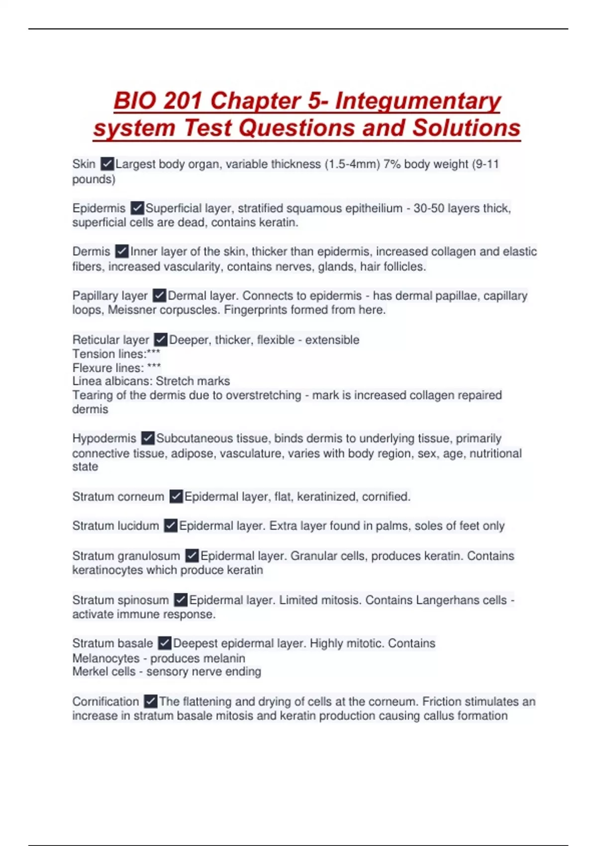 BIO 201 Chapter 5- Integumentary system Test Questions and Solutions