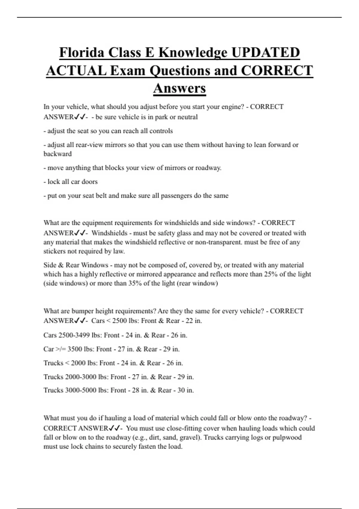 Florida Class E Knowledge UPDATED ACTUAL Exam Questions and CORRECT Answers In your vehicle, what should you adjust before you start your engine? - CORRECT ANSWER- - be sure vehicle is in park or neutral - adjust the seat so you can reach all controls - adjust all rear-view mirrors so that you can use them without having to lean forward or backward - move anything that blocks your view of mirrors or roadway. - lock all car doors - put on your seat belt and make sure all passengers do the same