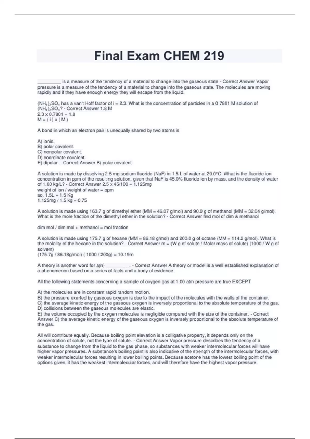 _________ is a measure of the tendency of a material to change into the gaseous state - Correct Answer Vapor pressure is a measure of the tendency of a material to change into the gaseous state. The molecules are moving rapidly and if they have enough energy they will escape from the liquid. (NH₄)₂SO₄ has a van't Hoff factor of i = 2.3. What is the concentration of particles in a 0.7801 M solution of (NH₄)₂SO₄? - Correct Answer 1.8 M 2.3 x 0.7801 = 1.8 M = ( i ) x ( M ) A bond in which an electron pair is unequally shared by two atoms is A) ionic. B) polar covalent. C) nonpolar covalent. D) coordinate covalent. E) dipolar. - Correct Answer B) polar covalent. A solution is made by dissolving 2.5 mg sodium fluoride (NaF) in 1.5 L of water at 20.0°C. What is the fluoride ion concentration in ppm of the resulting solution, given that NaF is 45.0% fluoride ion by mass, and the density of water of 1.00 kg/L? - Correct Answer 2.5 x 45/100 = 1.125mg weight of ion / weight of water = ppm so, 1.5L = 1.5 Kg 1.125mg / 1.5 kg = 0.75 A solution is made using 163.7 g of dimethyl ether (MM = 46.07 g/mol) and 90.0 g of methanol (MM = 32.04 g/mol). What is the mole fraction of the dimethyl ether in the solution? - Correct Answer find mol of dim & methanol dim mol / dim mol + methanol = mol fraction A solution is made using 175.7 g of hexane (MM = 86.18 g/mol) and 200.0 g of octane (MM = 114.2 g/mol). What is the molality of the hexane in the solution? - Correct Answer m = (W g of solute / Molar mass of solute) (1000 / W g of solvent) (175.7g / 86.18g/mol) ( 1000 / 200g) = 10.19m A theory is another word for a(n) _________. - Correct Answer A theory or model is a well established explanation of a phenomenon based on a series of facts and a body of evidence. All the following statements concerning a sample of oxygen gas at 1.00 atm pressure are true EXCEPT A) the molecules are in constant rapid random motion. B) the pressure exerted by gaseous oxygen is due to the impact of the molecules with the walls of the container. C) the average kinetic energy of the gaseous oxygen is inversely proportional to the absolute temperature of the gas. D) collisions between the gaseous molecules are elastic. E) the volume occupied by the oxygen molecules is negligible compared with the size of the container. - Correct Answer C) the average kinetic energy of the gaseous oxygen is inversely proportional to the absolute temperature of the gas. All will contribute equally. Because boiling point elevation is a colligative property, it depends only on the concentration of solute, not the type of solute. - Correct Answer Vapor pressure describes the tendency of a substance to change from the liquid to the gas phase, so substances with weaker intermolecular forces will have higher vapor pressures. A substance's boiling point is also indicative of the strength of the intermolecular forces, with weaker intermolecular forces resulting in lower boiling points. Because acetone has the lowest boiling point of the options given, it has the weakest intermolecular forces, and will therefore have the h