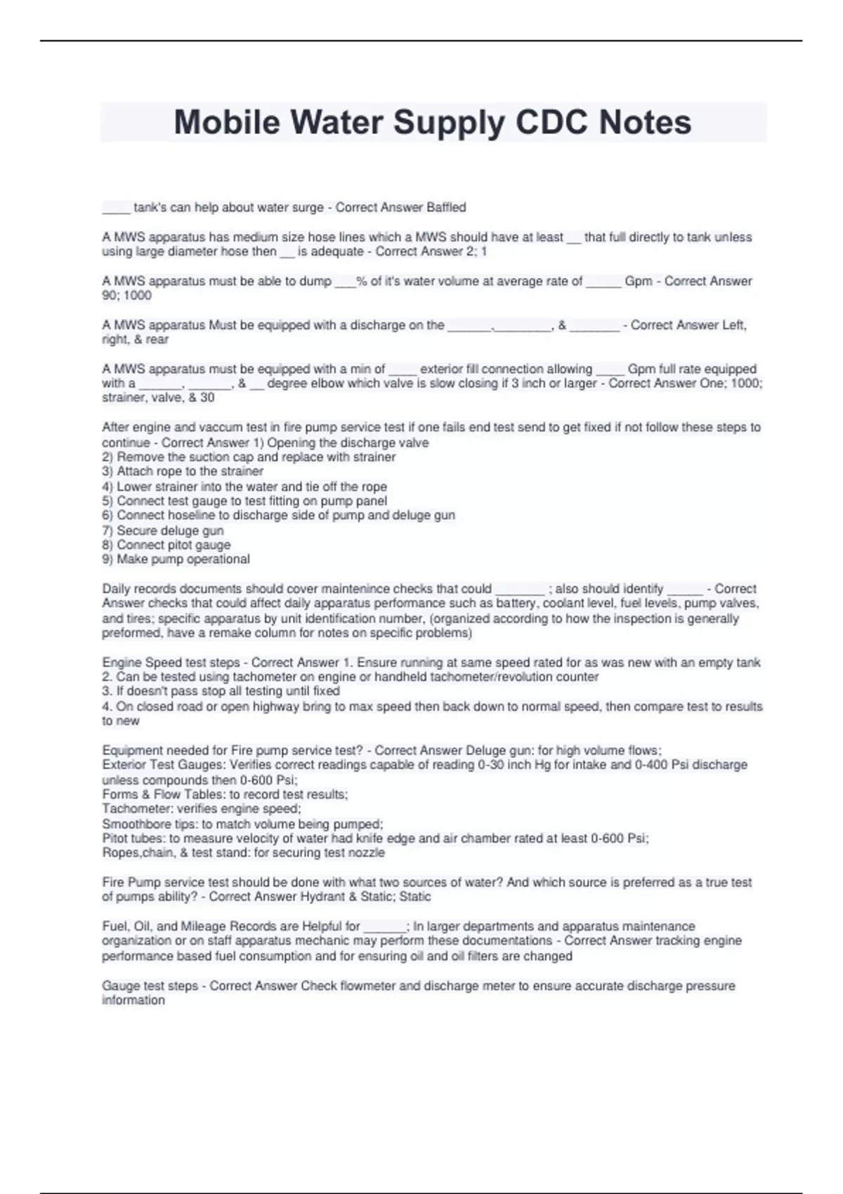 A MWS apparatus has medium size hose lines which a MWS should have at least __ that full directly to tank unless using large diameter hose then __ is adequate - Correct Answer 2; 1 A MWS apparatus must be able to dump ___% of it's water volume at average rate of _____ Gpm - Correct Answer 90; 1000 A MWS apparatus Must be equipped with a discharge on the ______,________, & _______ - Correct Answer Left, right, & rear A MWS apparatus must be equipped with a min of ____ exterior fill connection allowing ____ Gpm full rate equipped with a ______, ______, & __ degree elbow which valve is slow closing if 3 inch or larger - Correct Answer One; 1000; strainer, valve, & 30 After engine and vaccum test in fire pump service test if one fails end test send to get fixed if not follow these steps to continue - Correct Answer 1) Opening the discharge valve 2) Remove the suction cap and replace with strainer 3) Attach rope to the strainer 4) Lower strainer into the water and tie off the rope 5) Connect test gauge to test fitting on pump panel 6) Connect hoseline to discharge side of pump and deluge gun 7) Secure deluge gun 8) Connect pitot gauge 9) Make pump operational Daily records documents should cover maintenince checks that could _______ ; also should identify _____ - Correct Answer checks that could affect daily apparatus performance such as battery, coolant level, fuel levels, pump valves, and tires; specific apparatus by unit identification number, (organized according to how the inspection is generally preformed, have a remake column for notes on specific problems) Engine Speed test steps - Correct Answer 1. Ensure running at same speed rated for as was new with an empty tank 2. Can be tested using tachometer on engine or handheld tachometer/revolution counter 3. If doesn't pass stop all testing until fixed 4. On closed road or open highway bring to max speed then back down to normal speed, then compare test to results to new Equipment needed for Fire pump service test? - Correct Answer Deluge gun: for high volume flows; Exterior Test Gauges: Verifies correct readings capable of reading 0-30 inch Hg for intake and 0-400 Psi discharge unless compounds then 0-600 Psi; Forms & Flow Tables: to record test results; Tachometer: verifies engine speed; Smoothbore tips: to match volume being pumped; Pitot tubes: to measure velocity of water had knife edge and air chamber rated at least 0-600 Psi; Ropes,chain, & test stand: for securing test nozzle Fire Pump service test should be done with what two sources of water? And which source is preferred as a true test of pumps ability? - Correct Answer Hydrant & Static; Static Fuel, Oil, and Mileage Records are Helpful for ______; In larger departments and apparatus maintenance organization or on staff apparatus mechanic may perform these documentations - Correct Answer tracking engine