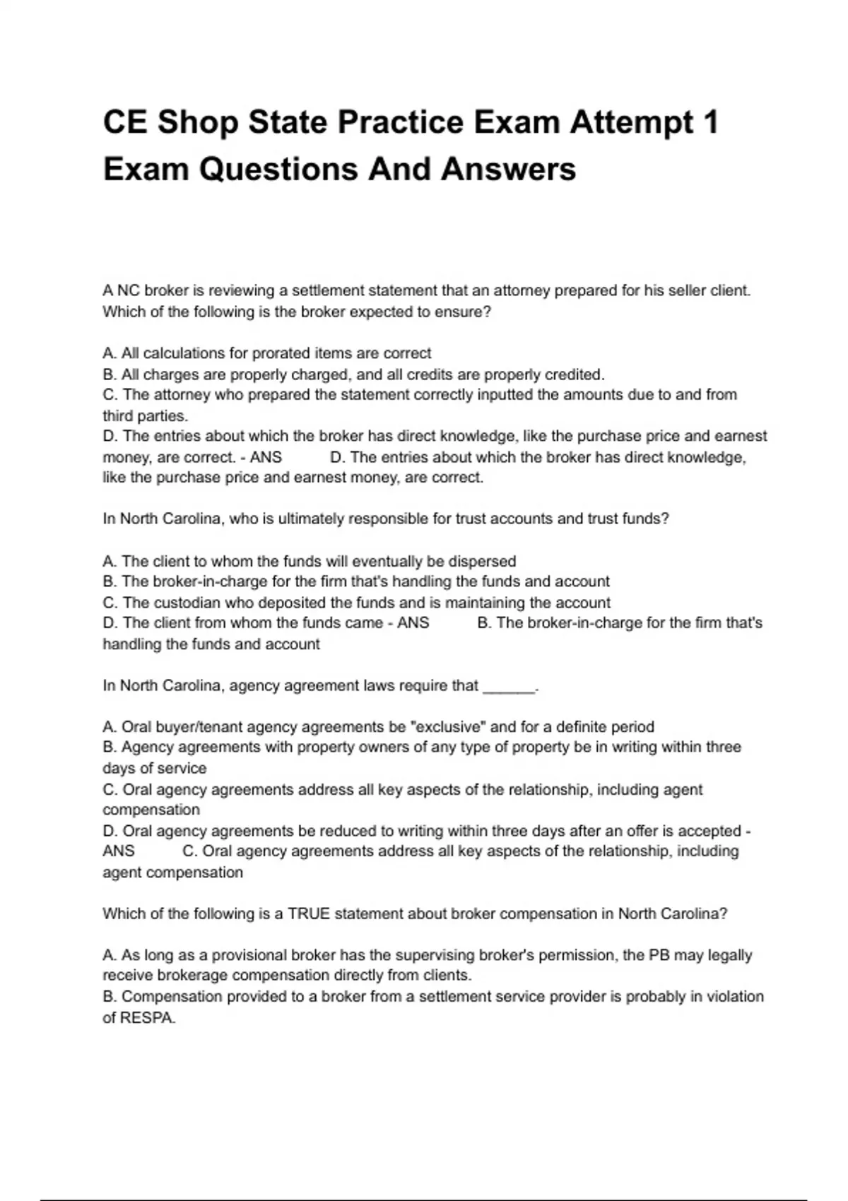 A NC broker is reviewing a settlement statement that an attorney prepared for his seller client. Which of the following is the broker expected to ensure? A. All calculations for prorated items are correct B. All charges are properly charged, and all credits are properly credited. C. The attorney who prepared the statement correctly inputted the amounts due to and from third parties. D. The entries about which the broker has direct knowledge, like the purchase price and earnest money, are correct. - ANS D. The entries about which the broker has direct knowledge, like the purchase price and earnest money, are correct. In North Carolina, who is ultimately responsible for trust accounts and trust funds? A. The client to whom the funds will eventually be dispersed B. The broker-in-charge for the firm that's handling the funds and account C. The custodian who deposited the funds and is maintaining the account D. The client from whom the funds came - ANS B. The broker-in-charge for the firm that's handling the funds and account In North Carolina, agency agreement laws require that ______. A. Oral buyer/tenant agency agreements be "exclusive" and for a definite period B. Agency agreements with property owners of any type of property be in writing within three days of service C. Oral agency agreements address all key aspects of the relationship, including agent compensation D. Oral agency agreements be reduced to writing within three days after an offer is accepted - ANS C. Oral agency agreements address all key aspects of the relationship, including agent compensation Which of the following is a TRUE statement about broker compensation in North Carolina? A. As long as a provisional broker has the supervising broker's permission, the PB may legally receive brokerage compensation directly from clients. B. Compensation provided to a broker from a settlement service provider is probably in violation of RESPA. C. A selling bonus the listing firm pays to the buyer's agent may be disclosed to the buyer client for the first time on the Closing Disclosure. D. Written disclosure of compensation received from anyone other than a broker's client must be made directly to the client by the closing day. - ANS B. Compensation provided to a broker from a settlement service provider is probably in violation of RESPA. The North Carolina Residential Rental Agreements Act states that ______.