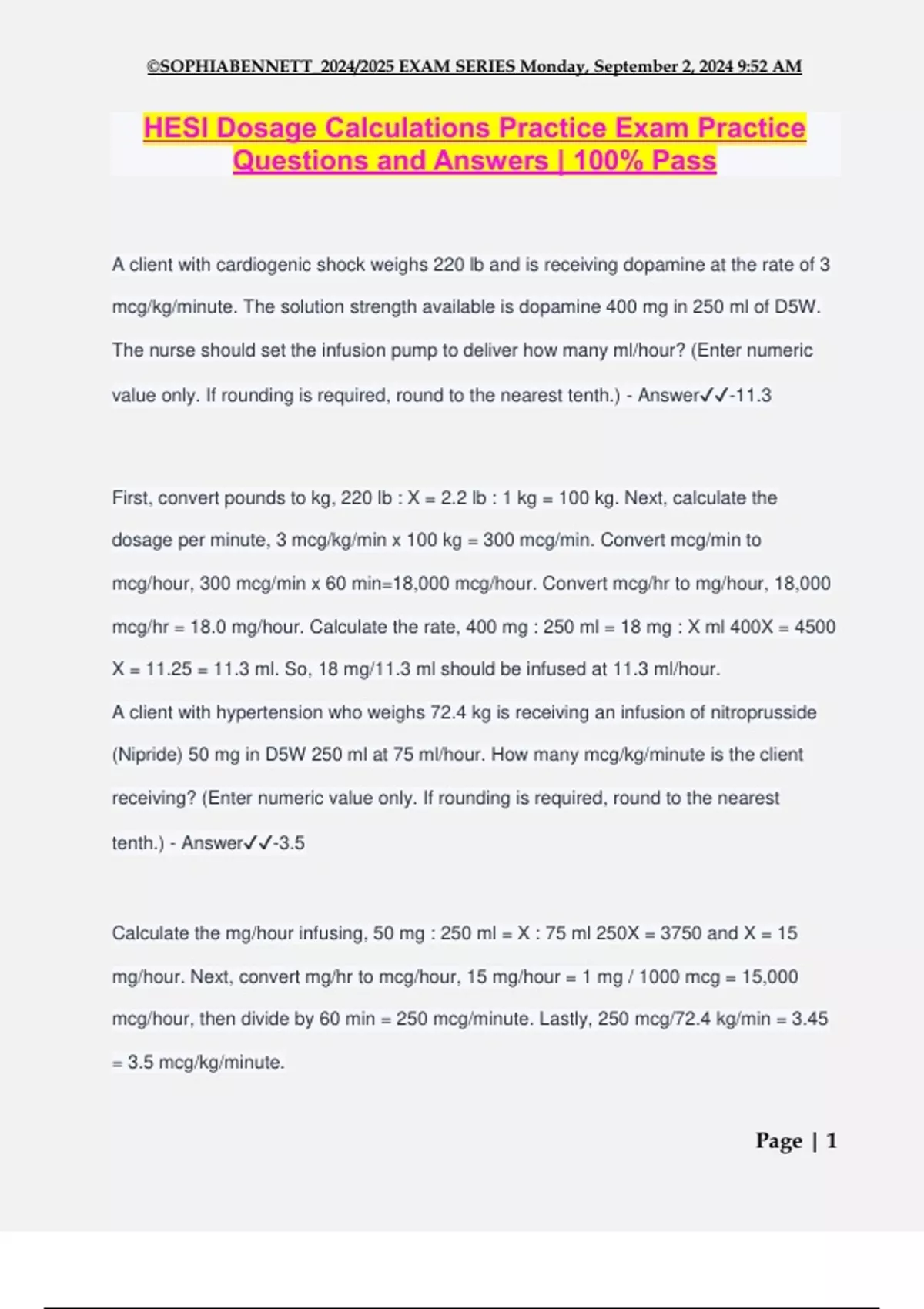 HESI Dosage Calculations Practice Exam Practice Questions and Answers | 100% Pass A client with cardiogenic shock weighs 220 lb and is receiving dopamine at the rate of 3 mcg/kg/minute. The solution strength available is dopamine 400 mg in 250 ml of D5W. The nurse should set the infusion pump to deliver how many ml/hour? (Enter numeric value only. If rounding is required, round to the nearest tenth.) - Answer️️ -11.3 First, convert pounds to kg, 220 lb : X = 2.2 lb : 1 kg = 100 kg. Next, calculate the dosage per minute, 3 mcg/kg/min x 100 kg = 300 mcg/min. Convert mcg/min to mcg/hour, 300 mcg/min x 60 min=18,000 mcg/hour. Convert mcg/hr to mg/hour, 18,000 mcg/hr = 18.0 mg/hour. Calculate the rate, 400 mg : 250 ml = 18 mg : X ml 400X = 4500 X = 11.25 = 11.3 ml. So, 18 mg/11.3 ml should be infused at 11.3 ml/hour. A client with hypertension who weighs 72.4 kg is receiving an infusion of nitroprusside (Nipride) 50 mg in D5W 250 ml at 75 ml/hour. How many mcg/kg/minute is the client receiving? (Enter numeric value only. If rounding is required, round to the nearest tenth.) - Answer️️ -3.5 Calculate the mg/hour infusing, 50 mg : 250 ml = X : 75 ml 250X = 3750 and X = 15 mg/hour. Next, convert mg/hr to mcg/hour, 15 mg/hour = 1 mg / 1000 mcg = 15,000 mcg/hour, then divide by 60 min = 250 mcg/minute. Lastly, 250 mcg/72.4 kg/min = 3.45 = 3.5 mcg/kg/minute. ©SOPHIABENNETT_2024/2025 EXAM SERIES Monday, September 2, 2024 9:52 AM Page | 2 A client who weighs 70 kg is receiving a dopamine solution of 800 mg/500 ml normal saline at 5 ml/hour. How many mcg/kg/minute is the client receiving? (Enter numeric value only. If rounding is required, round to the nearest tenth.) - Answer️️ -1.9 To change ml/hour to mcg/kg/minute, use the formula: desired rate (5 ml/hour) / volume available (500 ml) x dose available (800 mg) = 8 mg/hour. Next, convert milligrams/hour to mcg/kg/minute: mg (8) x 1000 / kg (70) / 60 minutes = 1.904 = 1.9 mcg/kg/minute. A client is receiving an IV solution of sodium chloride 0.9% (Normal Saline) 250 ml with amiodarone (Cordarone) 1 gram at 17 ml/hour. How many mg/minute of amiodarone is infusing? (Enter numeric value only. If rounding is required, round to the nearest tenth.) - Answer️️ -Convert grams to mg, 1 gram equals 1,000 mg. Using ratio and proportion - 1,000 mg : 250 ml :: X mg : 1ml 250X= 1,000 so X = 4 mg/ml is the solution concentration of amiodarone. The infusion rate (ml/hour) x concentration (mg/ml) divided by 60 minutes/hour 17 ml/hour x 4 mg/ml = 68/60 = 1.13 = 1.1 mg/minute. A client who weighs 176 pounds is receiving an IV infusion with esmolol hydrochloride (Brevibloc) at 48 ml/hour. The IV solution is labeled with the concentration of Brevibloc 10 mg/ml. How many mcg/kg/minute is the client receiving? (Enter numeric value only.) - Answer️️ -100 Convert pounds to kg by dividing 176 pounds by 2.2 pounds = 80 kg. Convert the IV concentration from mg to mcg. 1 mg : 1000 mcg :: 10 mg : 10,000 mcg. Infusion rate (48 ml/hour) x concentration (10,000 mcg/ml) divided by 60 minutes/hour x 80 kg = 48 x 10,000 divided by 60 x 80 = 480,000 / 4800 = 100 mcg/kg/minute. ©SOPHIABENNETT_2024/2025 EXAM SERIES Monday, September 2, 2024 9:52 AM Page | 3 The nurse is preparing the change-of-shift report for a client who has a 265 ml secondary infusion that was started 2 hours ago at a rate of 85 ml/hour via an infusion pump. The nurse should report that how many ml remain to be infused by the on- coming nurse? (Enter numeric value only.) - Answer️️ -95 85 ml x 2 hours = 170 ml has infused. 265 ml (total amount to be infused) - 170 ml (amount infused) = 95 ml remain to be infused. A male client receives a prescription for ondansetron hydrochloride (Zofran) 4 mg IV to prevent postoperative nausea after an inguinal hernia repair. The medication is available in 2 mg/ml. How many ml should the nurse administer? (Enter numeric value only.) - Answer️️ -2 Use ratio and proportion, 4 mg : X ml = 2 mg : 1 ml 2X = 4 X = 2 The nurse is preparing to administer Hepatitis B Vaccine, Recombinant (Energix-B) 5 mcg IM to a school-aged child. The vaccine is labeled, 10 mcg/ml. How many ml should the nurse administer? (Enter numeric value only. If rounding is required, round to the nearest tenth). - Answer️️ -1 or 0.5 Use ratio and proportion, 5 mcg : X ml :: 10 mcg : 1ml 10X = 5 X = 0.5 ml A client's daily PO prescription for aripiprazole (Abilify) is increased from 15 mg to 30 mg. The medication is available in 15 mg tablets, and the client already received one tablet today. How many additional tablets should the nurse administer so the client ©SOPHIABENNETT_2024/2025 EXAM SERIES Monday, September 2, 2024 9:52 AM Page | 4 receives the total newly prescribed dose for the day? (Enter numeric value only.) - Answer️️ -1 30 mg (total dose) - 15 mg (dose already administered) = 15 mg that still needs to be administered. Using the Desired/Have formula: 15 mg/15 mg = 1 tablet At the end of the shift, the nurse is recording the fluid balance for a client receiving a continuous gastrostomy tube (GT) feeding. Based on the client's records, how many ml should the nurse record for the total fluid balance (intake - output) for the shift that started at 0700 and ended at 1900? (Enter numeric value only.) (Click on each image asset for additional information.) - Answer️️ -695 The tube feeding is administered at 75 ml/hour for 11 hours () and then turned off for one hour because the residual is greater than 200 ml. 11 hours x 75 ml/hr = 825 ml. Three doses of 20 ml of medication are administered, with 10 ml of water used to flush the GT before and after each dose. 20 ml x 3 doses = 60 ml; 10 ml (flush) x 2 x 3 doses = 60 ml; so 825 ml + 60 ml + 60 ml = 945 ml. 250 ml of residual is removed and not replaced. 945 ml - 250 ml = 695 ml total fluid balance (Intake - output). The nurse is administering a 250 milliliter (ml) intravenous solution to be infused over 2 hours. How many ml