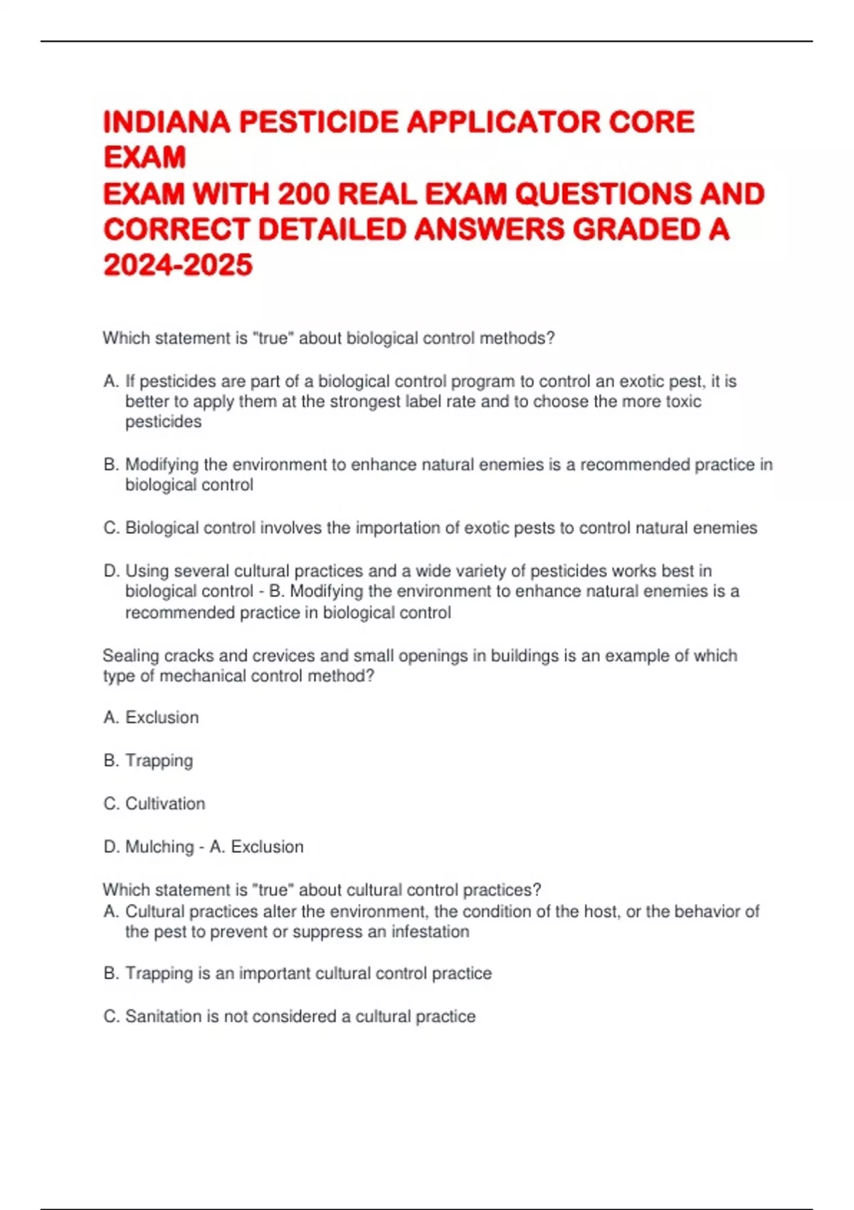 INDIANA PESTICIDE APPLICATOR CORE EXAM EXAM WITH 200 REAL EXAM QUESTIONS AND CORRECT DETAILED ANSWERS GRADED A