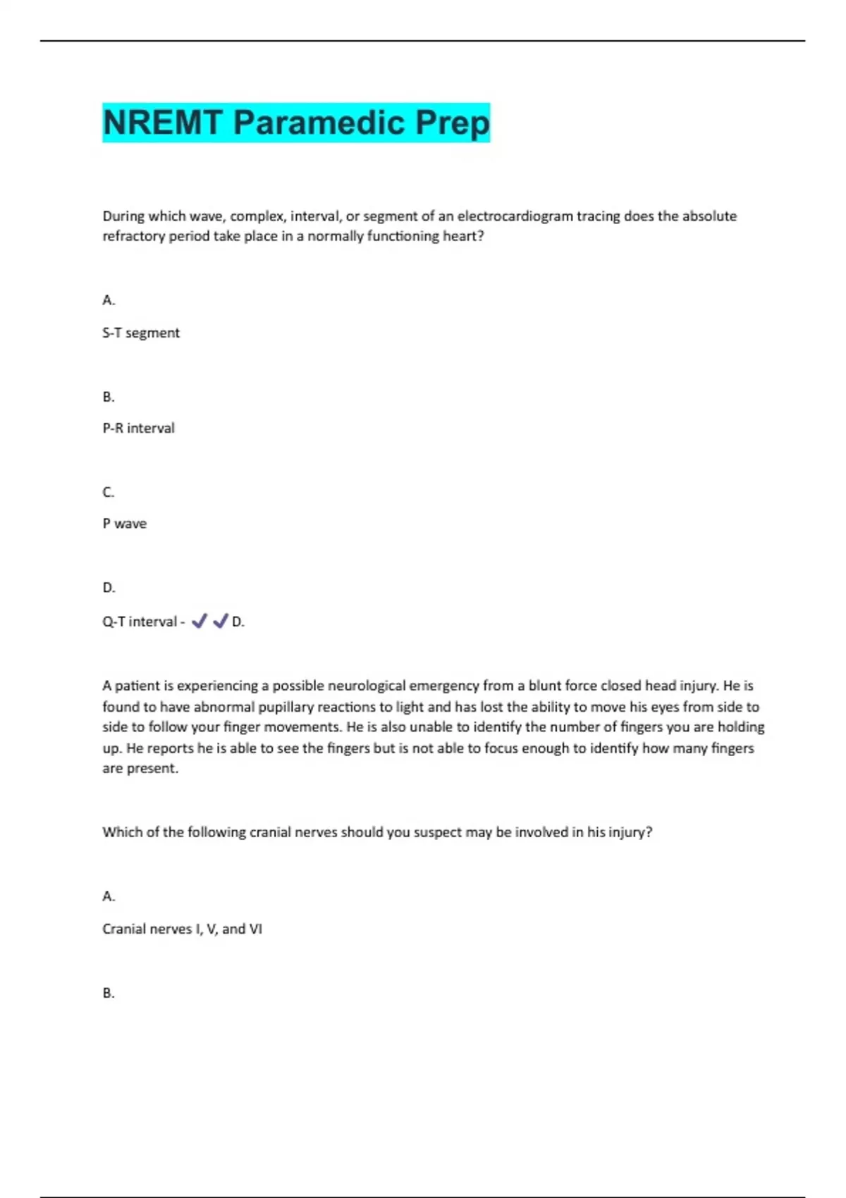 During which wave, complex, interval, or segment of an electrocardiogram tracing does the absolute refractory period take place in a normally functioning heart? A. S-T segment B. P-R interval C. P wave D. Q-T interval - D. A patient is experiencing a possible neurological emergency from a blunt force closed head injury. He is found to have abnormal pupillary reactions to light and has lost the ability to move his eyes from side to side to follow your finger movements. He is also unable to identify the number of fingers you are holding up. He reports he is able to see the fingers but is not able to focus enough to identify how many fingers are present. Which of the following cranial nerves should you suspect may be involved in his injury? A. Cranial nerves I, V, and VI B.Cranial nerves V and VII C. Cranial nerves IX and X D. Cranial nerves II, III, and IV - D. You are called to assist an adult with chest pain. The patient has a cardiac history of two-posterior myocardial infarctions. He is conscious and alert, stating he is having a hard time breathing, and the chest pain worsens when he attempts to lay flat on his back. His skin is pale and hot, while auscultation of his lung sounds reveals mild crackles. He reports the pain worsens on deep inspiration and movement. Based on the patient's history, and signs and symptoms, which of the following should you suspect? A. Unstable angina pectoris B. Pericarditis C. Myocardial infarction D. Cardiomyopathy - B.You are the first ambulance to arrive on the scene of a single-car accident. As you approach the scene, you see four patients, two have been ejected from their vehicle, and two are still in the vehicle. What should be your next course of action? A. Call medical control, and advise them of the situation B. Request additional resources, such as fire rescue, and additional ambulances to respond to the scene C. Begin immediate triage and treatment of the two patients ejected first while awaiting fire department response D. Notify the local trauma center so they can prepare for the patients - B.