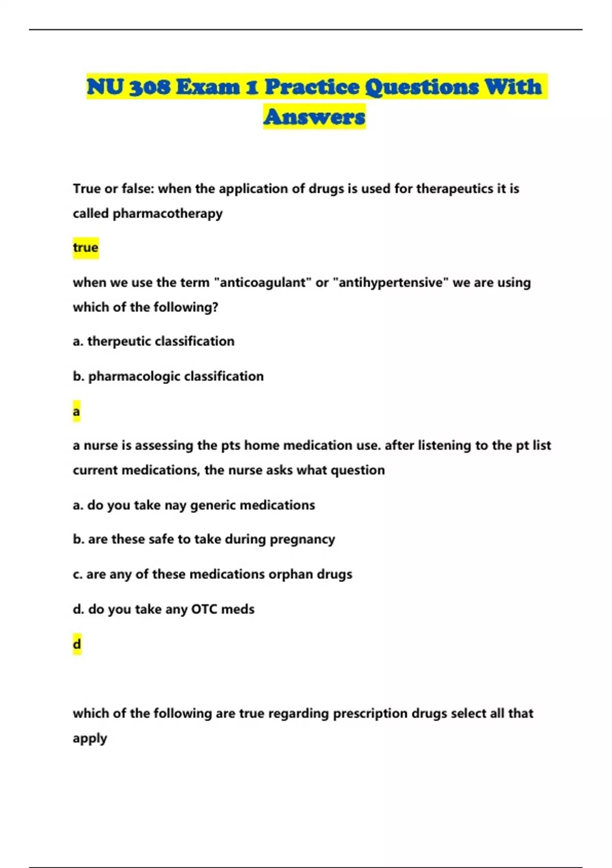 NU 308 Exam 1 Practice Questions With