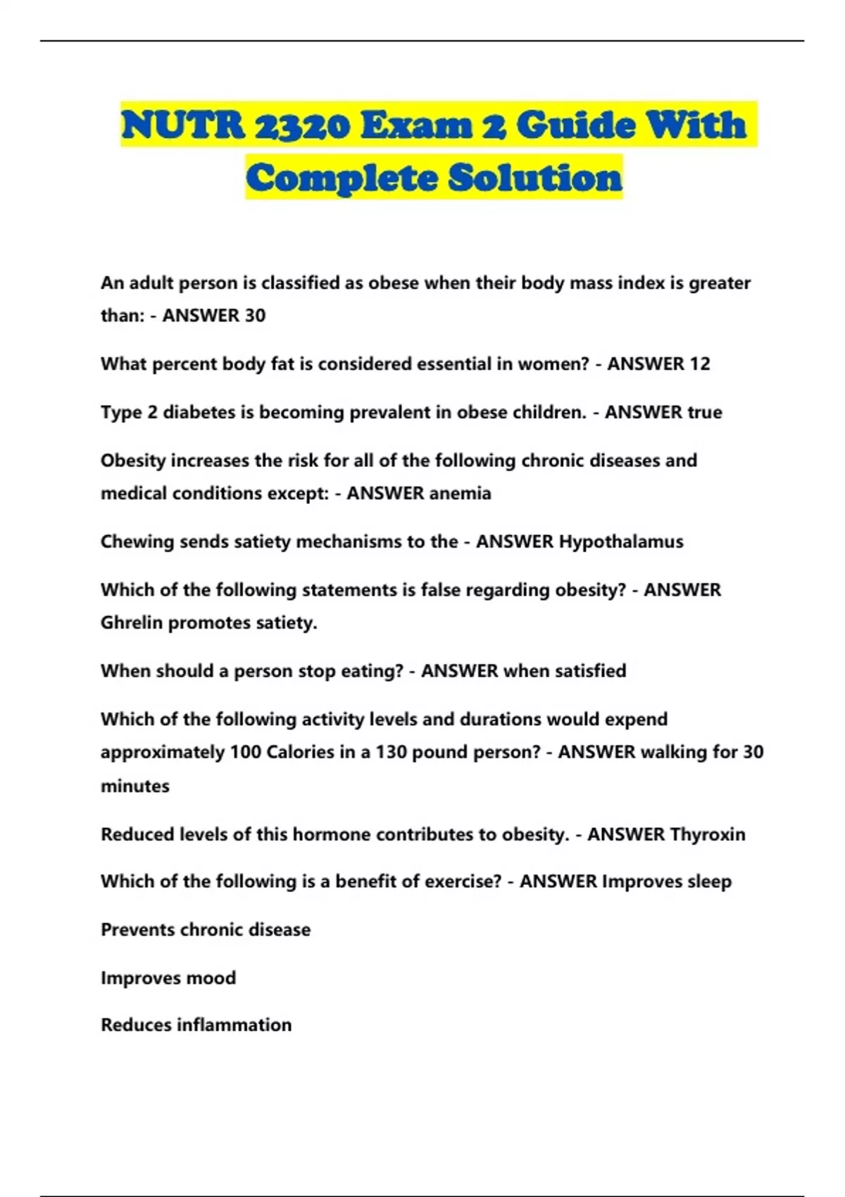 NUTR 2320 Exam 2 Guide With Complete Solution...