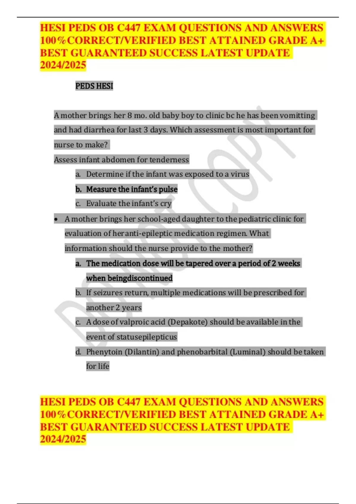 HESI PEDS OB C447 EXAM QUESTIONS AND ANSWERS 100% CORRECT VERIFIED BEST ATTAINED GRADE A+ BEST GUARANTEED SUCCESS LATEST UPDATE 2024/2025