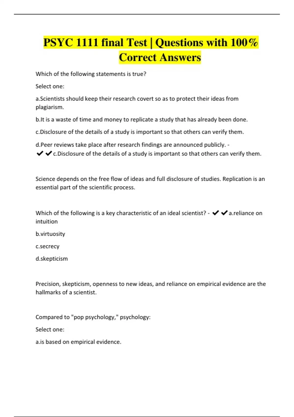 PSYC 1111 final Test | Questions with 100%