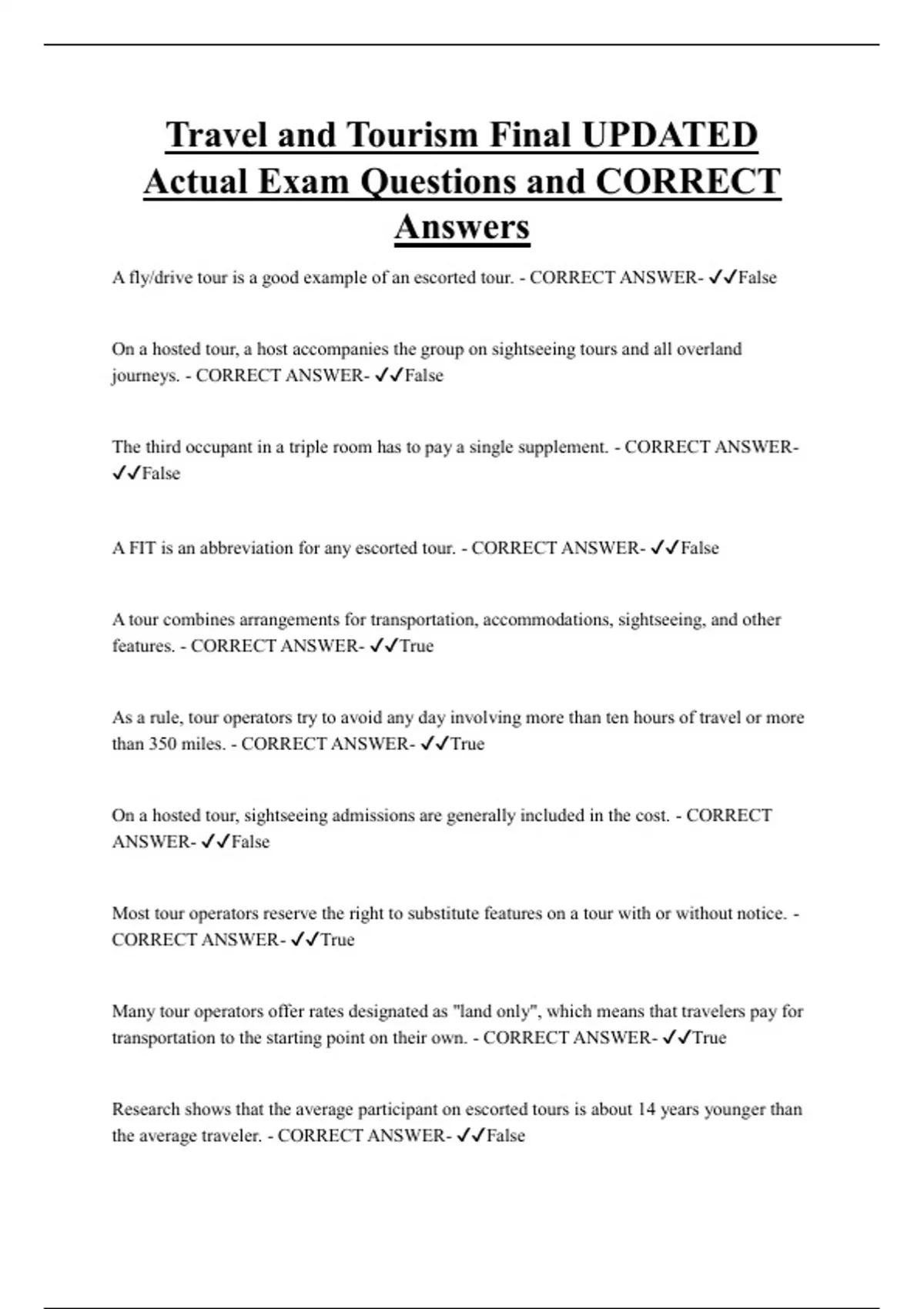 A fly/drive tour is a good example of an escorted tour. - CORRECT ANSWER- ✔✔False