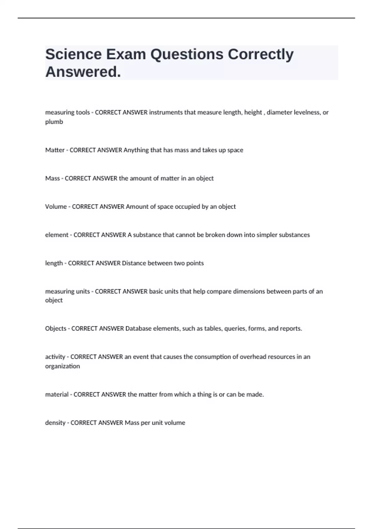 Science Exam Questions Correctly Answered. measuring tools - CORRECT ANSWER instruments that measure length, height , diameter levelness, or plumb Matter - CORRECT ANSWER Anything that has mass and takes up space Mass - CORRECT ANSWER the amount of matter in an object Volume - CORRECT ANSWER Amount of space occupied by an object element - CORRECT ANSWER A substance that cannot be broken down into simpler substances length - CORRECT ANSWER Distance between two points measuring units - CORRECT ANSWER basic units that help compare dimensions between parts of an object Objects - CORRECT ANSWER Database elements, such as tables, queries, forms, and reports. activity - CORRECT ANSWER an event that causes the consumption of overhead resources in an organization material - CORRECT ANSWER the matter from which a thing is or can be made. density - CORRECT ANSWER Mass per unit volume