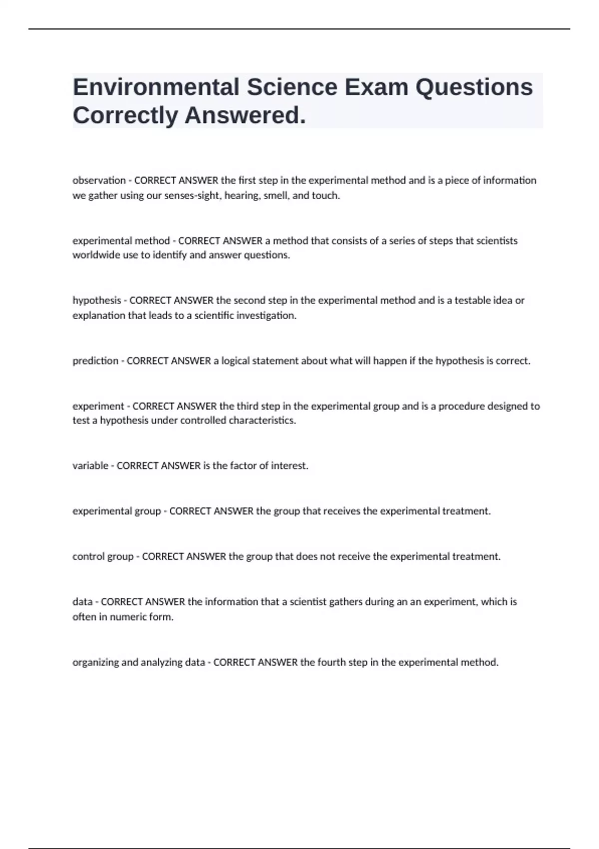 Environmental Science Exam Questions Correctly Answered. observation - CORRECT ANSWER the first step in the experimental method and is a piece of information we gather using our senses-sight, hearing, smell, and touch. experimental method - CORRECT ANSWER a method that consists of a series of steps that scientists worldwide use to identify and answer questions. hypothesis - CORRECT ANSWER the second step in the experimental method and is a testable idea or explanation that leads to a scientific investigation. prediction - CORRECT ANSWER a logical statement about what will happen if the hypothesis is correct. experiment - CORRECT ANSWER the third step in the experimental group and is a procedure designed to test a hypothesis under controlled characteristics. variable - CORRECT ANSWER is the factor of interest. experimental group - CORRECT ANSWER the group that receives the experimental treatment. control group - CORRECT ANSWER the group that does not receive the experimental treatment. data - CORRECT ANSWER the information that a scientist gathers during an an experiment, which is often in numeric form. organizing and analyzing data - CORRECT ANSWER the fourth step in the experimental method.