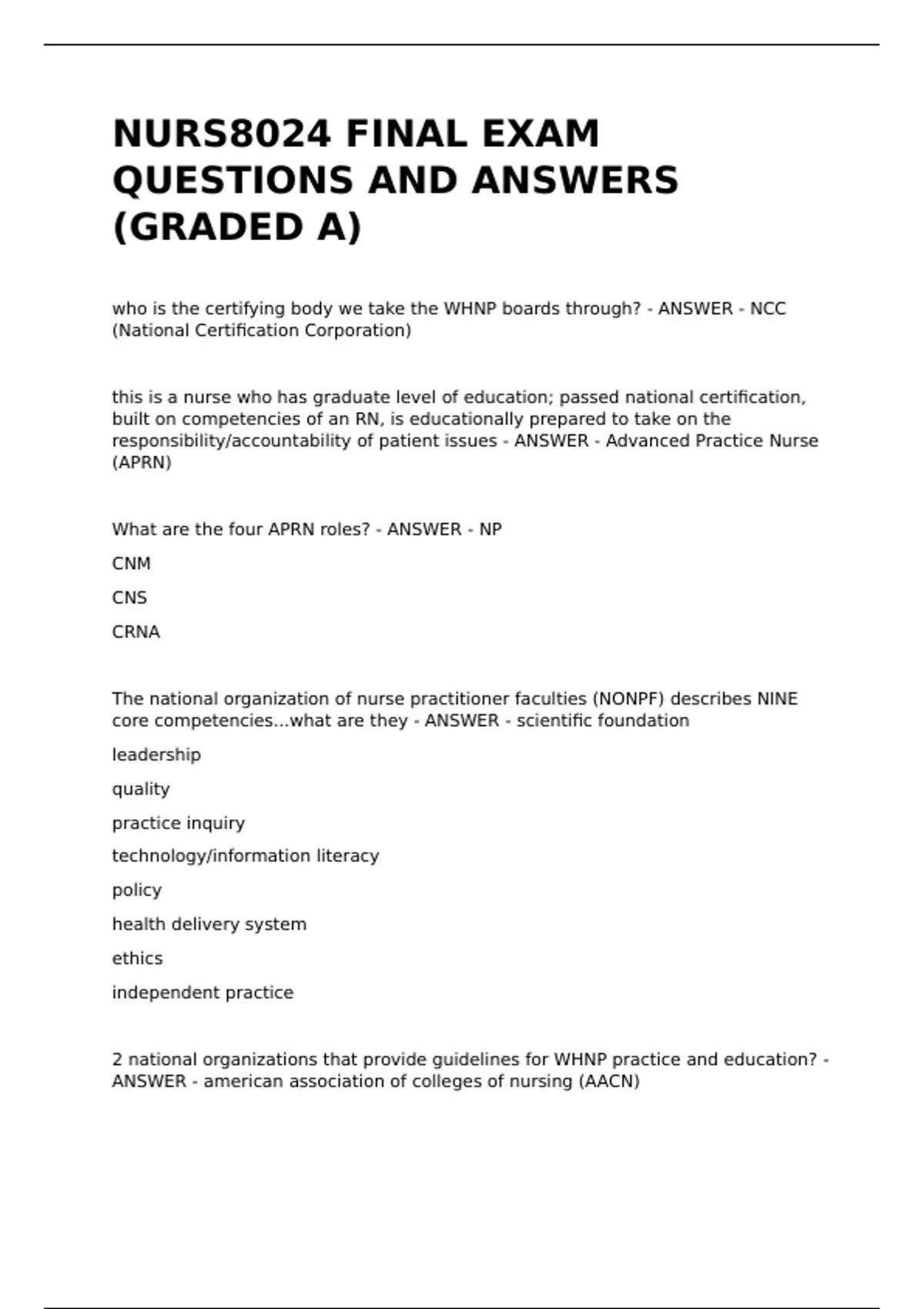NURS8024 FINAL EXAM QUESTIONS AND ANSWERS (GRADED A)NURS8024 FINAL EXAM QUESTIONS AND ANSWERS (GRADED A)NURS8024 FINAL EXAM QUESTIONS AND ANSWERS (GRADED A)NURS8024 FINAL EXAM QUESTIONS AND ANSWERS (GRADED A) who is the certifying body we take the WHNP boards through? - ANSWER - NCC (National Certification Corporation) this is a nurse who has graduate level of education; passed national certification, built on competencies of an RN, is educationally prepared to take on the responsibility/accountability of patient issues - ANSWER - Advanced Practice Nurse (APRN) What are the four APRN roles? - ANSWER - NP CNM CNS