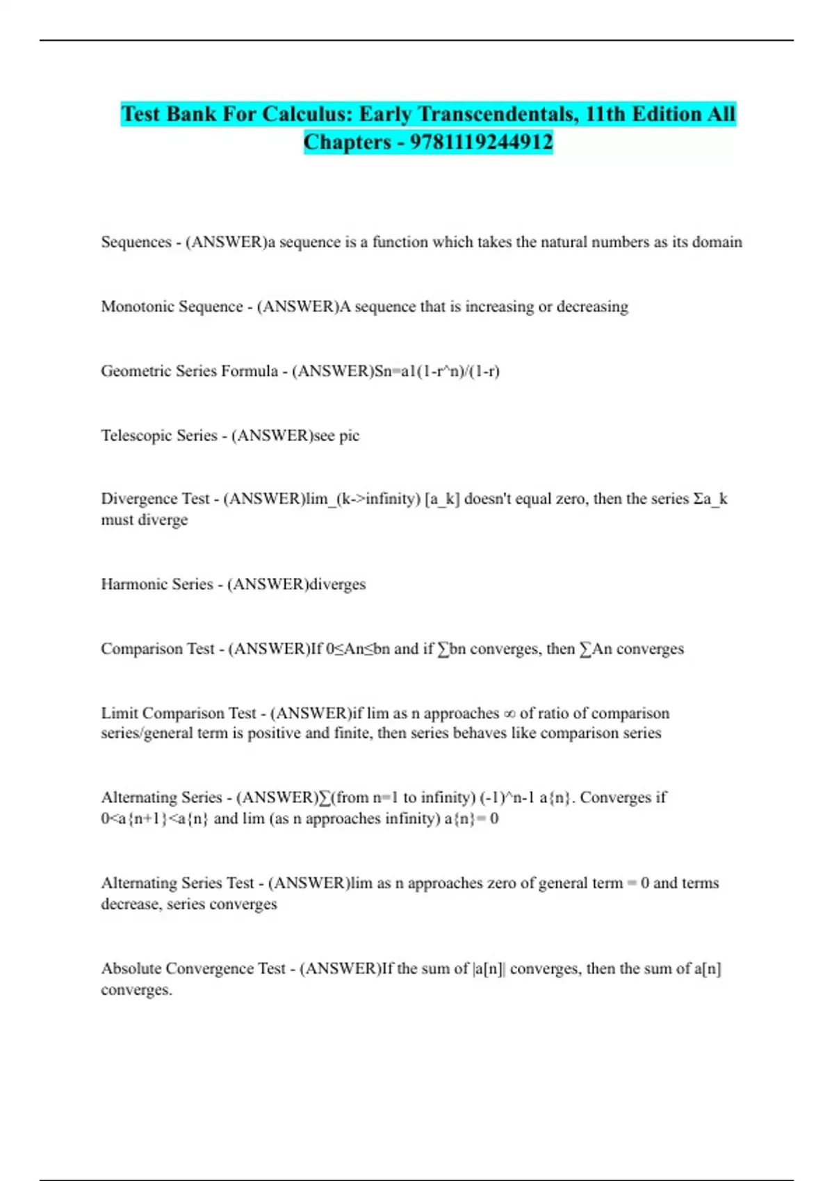 Test Bank For Calculus: Early Transcendentals, 11th Edition All