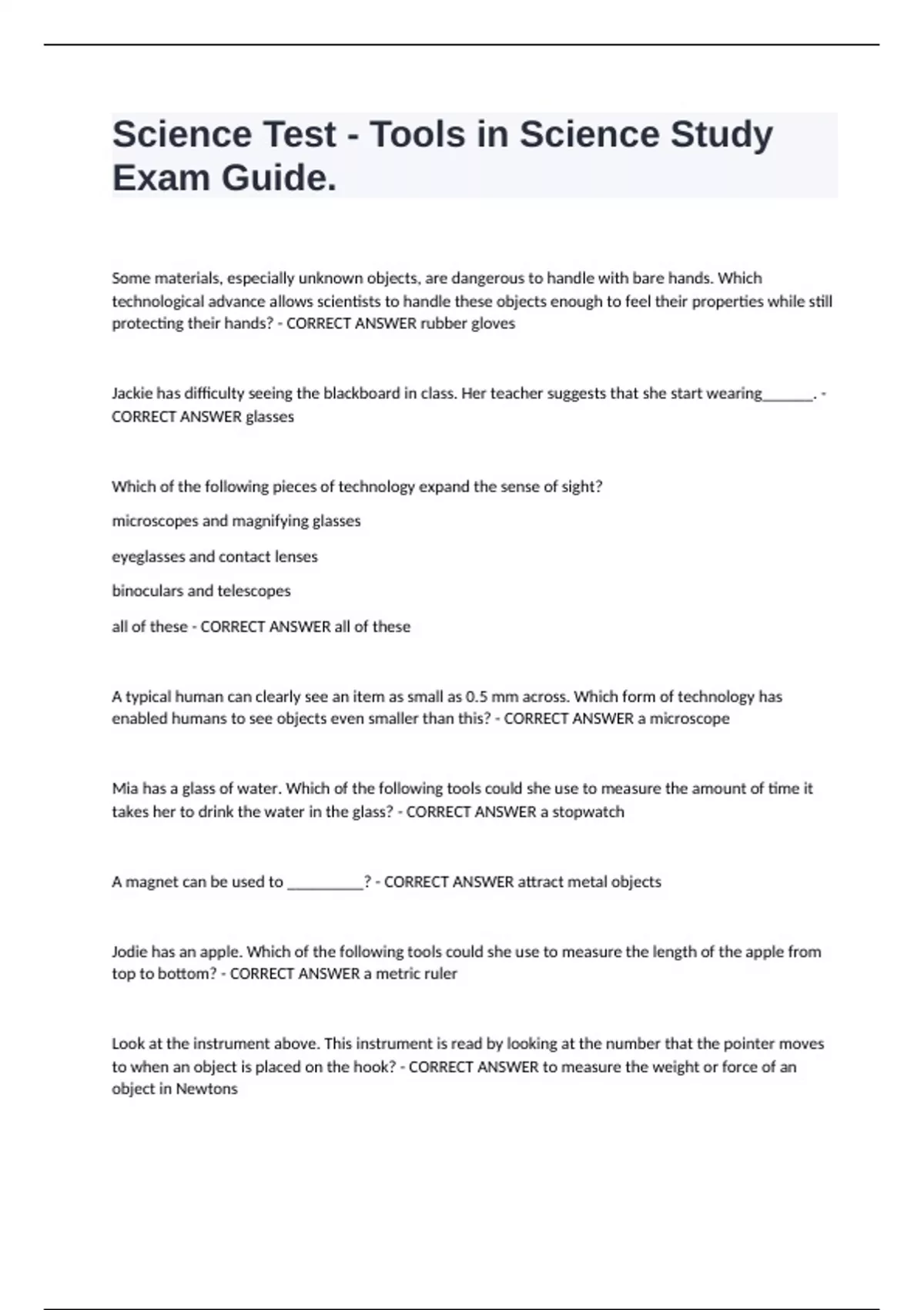 Science Test - Tools in Science Study Exam Guide. Some materials, especially unknown objects, are dangerous to handle with bare hands. Which technological advance allows scientists to handle these objects enough to feel their properties while still protecting their hands? - CORRECT ANSWER rubber gloves Jackie has difficulty seeing the blackboard in class. Her teacher suggests that she start wearing______. - CORRECT ANSWER glasses Which of the following pieces of technology expand the sense of sight? microscopes and magnifying glasses eyeglasses and contact lenses binoculars and telescopes all of these - CORRECT ANSWER all of these A typical human can clearly see an item as small as 0.5 mm across. Which form of technology has enabled humans to see objects even smaller than this? - CORRECT ANSWER a microscope Mia has a glass of water. Which of the following tools could she use to measure the amount of time it takes her to drink the water in the glass? - CORRECT ANSWER a stopwatch A magnet can be used to _________? - CORRECT ANSWER attract metal objects Jodie has an apple. Which of the following tools could she use to measure the length of the apple from top to bottom? - CORRECT ANSWER a metric ruler Look at the instrument above. This instrument is read by looking at the number that the pointer moves to when an object is placed on the hook? - CORRECT ANSWER to measure the weight or force of an object in Newtons