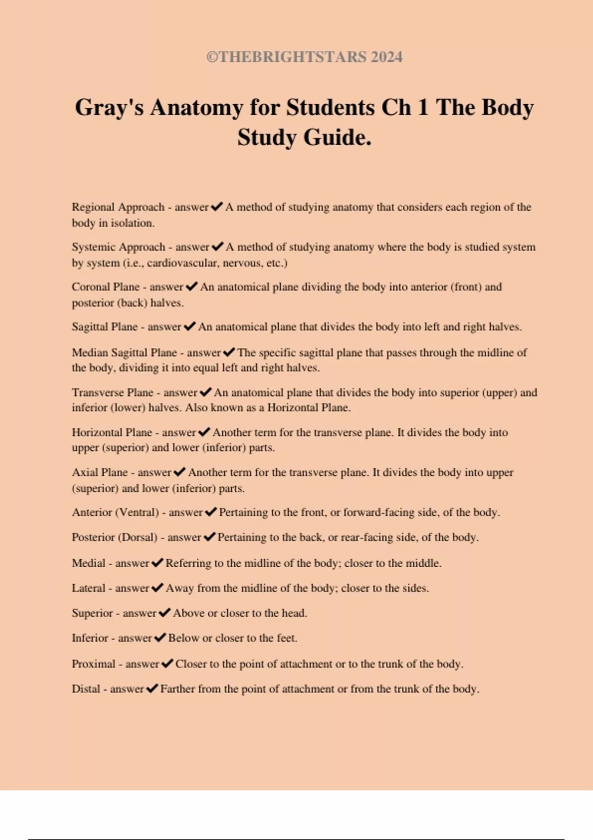Transverse Plane - answer✔An anatomical plane that divides the body into superior (upper) and