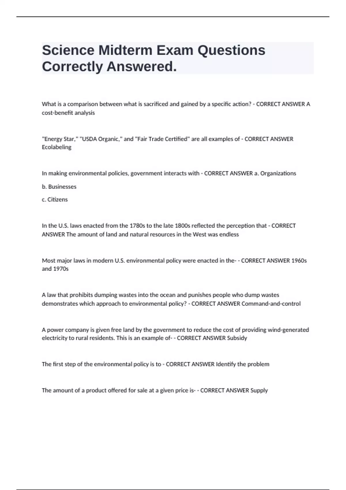 In making environmental policies, government interacts with - CORRECT ANSWER a. Organizations
