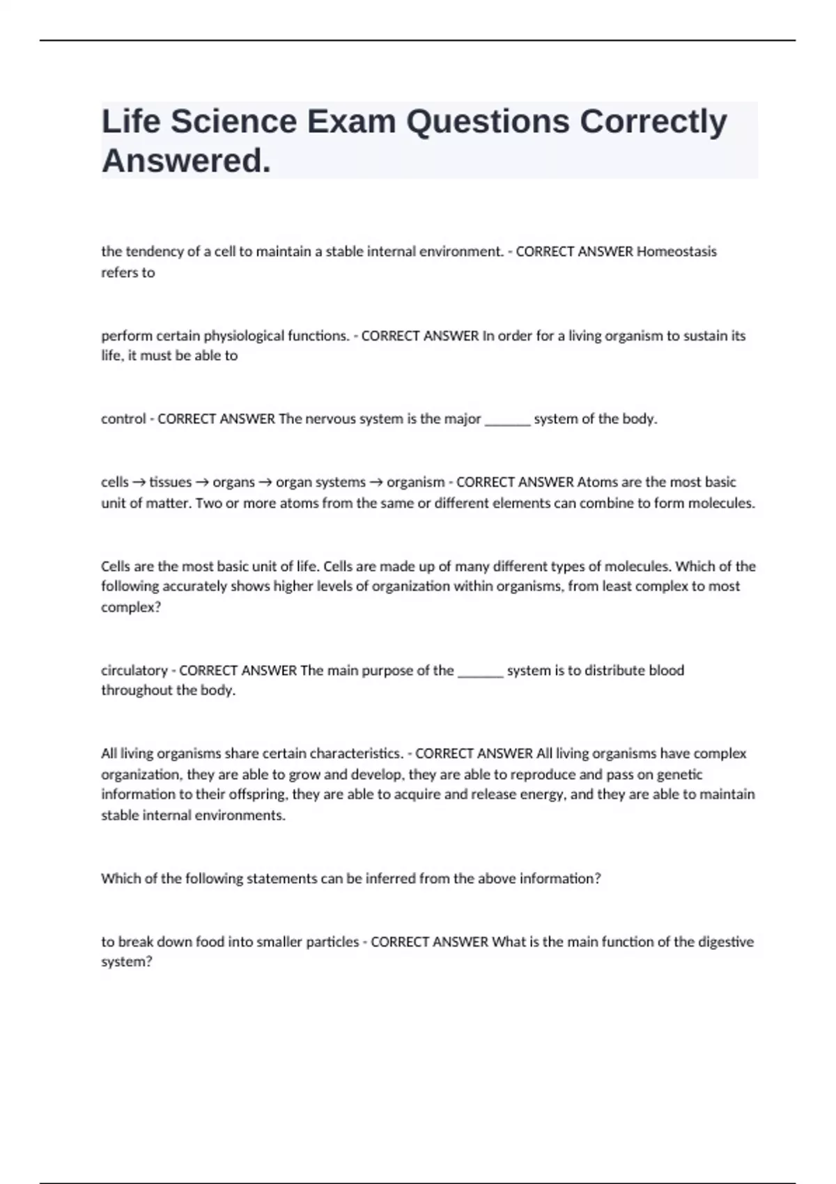Life Science Exam Questions Correctly Answered. the tendency of a cell to maintain a stable internal environment. - CORRECT ANSWER Homeostasis refers to perform certain physiological functions. - CORRECT ANSWER In order for a living organism to sustain its life, it must be able to control - CORRECT ANSWER The nervous system is the major ______ system of the body. cells → tissues → organs → organ systems → organism - CORRECT ANSWER Atoms are the most basic unit of matter. Two or more atoms from the same or different elements can combine to form molecules. Cells are the most basic unit of life. Cells are made up of many different types of molecules. Which of the following accurately shows higher levels of organization within organisms, from least complex to most complex? circulatory - CORRECT ANSWER The main purpose of the ______ system is to distribute blood throughout the body. All living organisms share certain characteristics. - CORRECT ANSWER All living organisms have complex organization, they are able to grow and develop, they are able to reproduce and pass on genetic information to their offspring, they are able to acquire and release energy, and they are able to maintain stable internal environments. Which of the following statements can be inferred from the above information? to break down food into smaller particles - CORRECT ANSWER What is the main function of the digestive system?