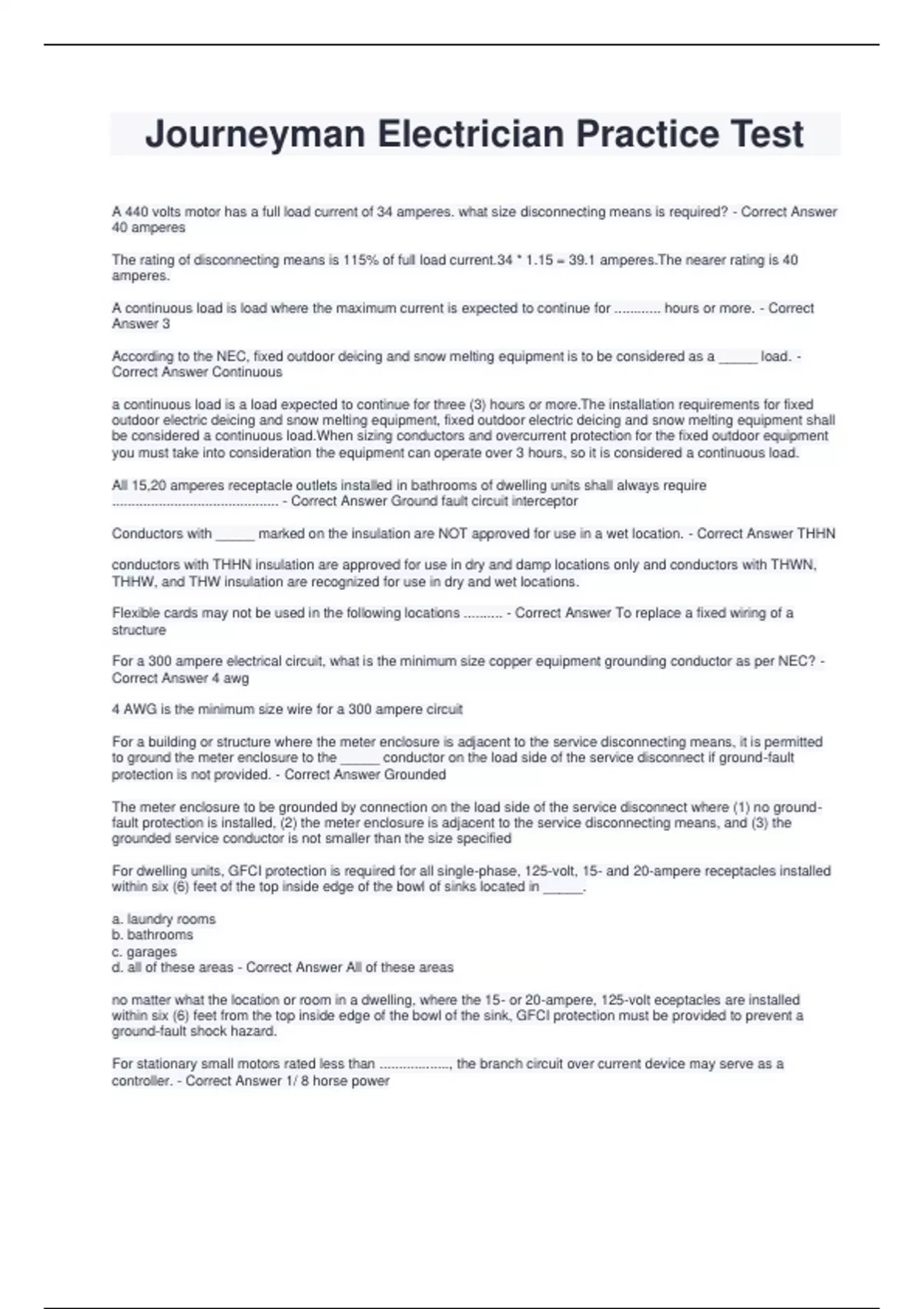 A 440 volts motor has a full load current of 34 amperes. what size disconnecting means is required? - Correct Answer 40 amperes The rating of disconnecting means is 115% of full load current.34 * 1.15 = 39.1 amperes.The nearer rating is 40 amperes. A continuous load is load where the maximum current is expected to continue for ............ hours or more. - Correct Answer 3 According to the NEC, fixed outdoor deicing and snow melting equipment is to be considered as a _____ load. - Correct Answer Continuous a continuous load is a load expected to continue for three (3) hours or more.The installation requirements for fixed outdoor electric deicing and snow melting equipment, fixed outdoor electric deicing and snow melting equipment shall be considered a continuous load.When sizing conductors and overcurrent protection for the fixed outdoor equipment you must take into consideration the equipment can operate over 3 hours, so it is considered a continuous load. All 15,20 amperes receptacle outlets installed in bathrooms of dwelling units shall always require ........................................... - Correct Answer Ground fault circuit interceptor Conductors with _____ marked on the insulation are NOT approved for use in a wet location. - Correct Answer THHN conductors with THHN insulation are approved for use in dry and damp locations only and conductors with THWN, THHW, and THW insulation are recognized for use in dry and wet locations. Flexible cards may not be used in the following locations .......... - Correct Answer To replace a fixed wiring of a structure For a 300 ampere electrical circuit, what is the minimum size copper equipment grounding conductor as per NEC? - Correct Answer 4 awg 4 AWG is the minimum size wire for a 300 ampere circuit For a building or structure where the meter enclosure is adjacent to the service disconnecting means, it is permitted to ground the meter enclosure to the _____ conductor on the load side of the service disconnect if ground-fault protection is not provided. - Correct Answer Grounded The meter enclosure to be grounded by connection on the load side of the service disconnect where (1) no groun