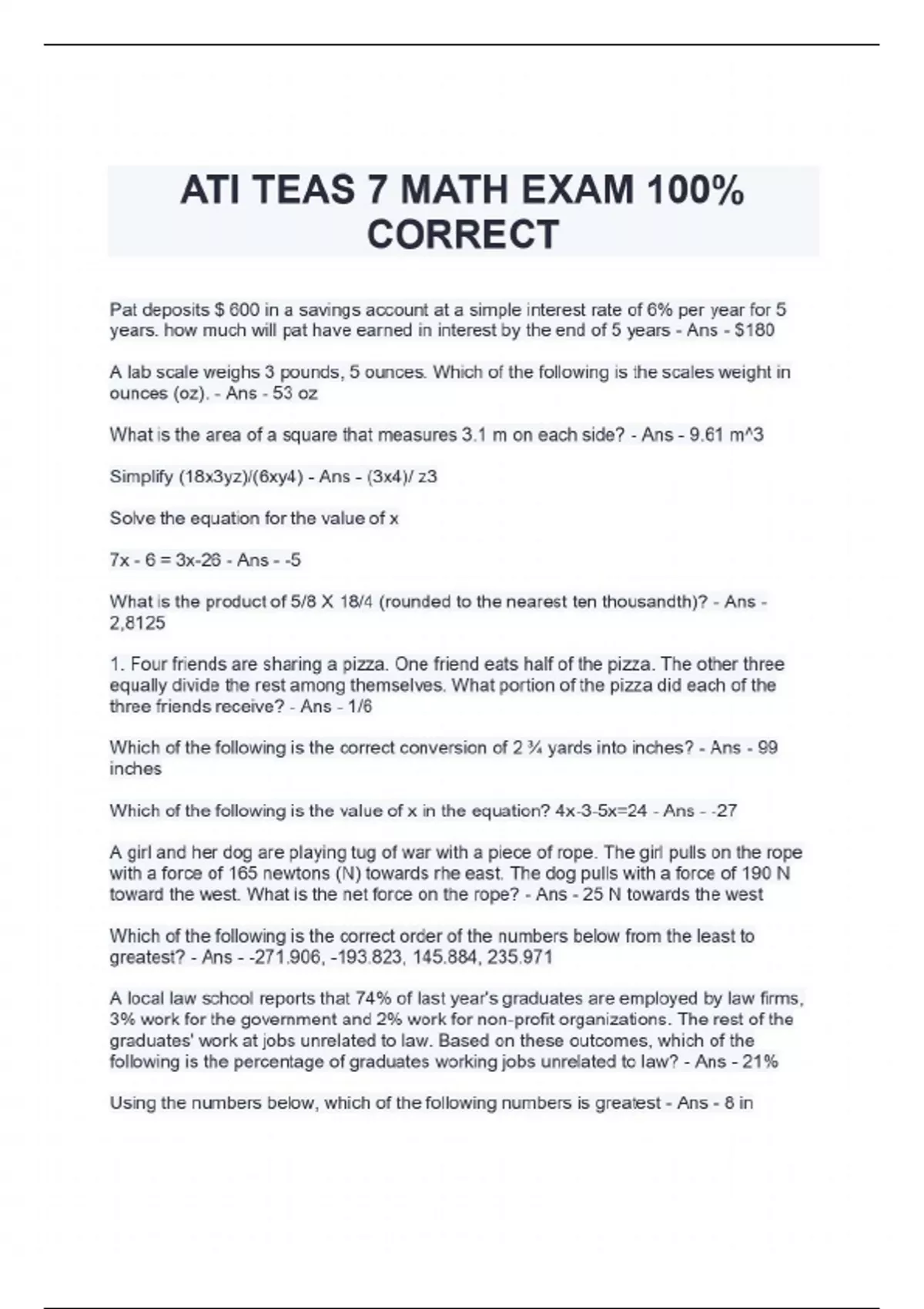 Pat deposits $ 600 in a savings account at a simple interest rate of 6% per year for 5 years. how much will pat have earned in interest by the end of 5 years - Ans - $180 A lab scale weighs 3 pounds, 5 ounces. Which of the following is the scales weight in ounces (oz). - Ans - 53 oz What is the area of a square that measures 3.1 m on each side? - Ans - 9.61 m^3 Simplify (18x3yz)/(6xy4) - Ans - (3x4)/ z3 Solve the equation for the value of x 7x - 6 = 3x-26 - Ans - -5 What is the product of 5/8 X 18/4 (rounded to the nearest ten thousandth)? - Ans - 2,8125 1. Four friends are sharing a pizza. One friend eats half of the pizza. The other three equally divide the rest among themselves. What portion of the pizza did each of the three friends receive? - Ans - 1/6 Which of the following is the correct conversion of 2 ¾ yards into inches? - Ans - 99 inches Which of the following is the value of x in the equation? 4x-3-5x=24 - Ans - -27 A girl and her dog are playing tug of war with a piece of rope. The girl pulls on the rope with a force of 165 newtons (N) towards rhe east. The dog pulls with a force of 190 N toward the west. What is the net force on the rope? - Ans - 25 N towards the west Which of the following is the correct order of the numbers below from the least to greatest? - Ans - -271.906, -193.823, 145.884, 235.971 A local law school reports that 74% of last year's graduates are employed by law firms, 3% work for the government and 2% work for non-profit organizations. The rest of the graduates' work at jobs unrelated to law. Based on these outcomes, which of the following is the percentage of graduates working jobs unrelated to law? - Ans - 21% Using the numbers below, which of the following numbers is greatest - Ans - 8 in 1. An athlete can run 6 miles in 51 minutes. At this rate, how many miles could the athlete run in 90 minutes? - Ans - 10.6 miles Four hundred milligrams equals to how many grams? - Ans - 0.4 g Arrange the following in order from the greatest to least. - Ans - 265/100, 20%, 270%, 2.6 A garden in the shape of a square has an area of 13 square feet. Each side of the garden has a length of √13