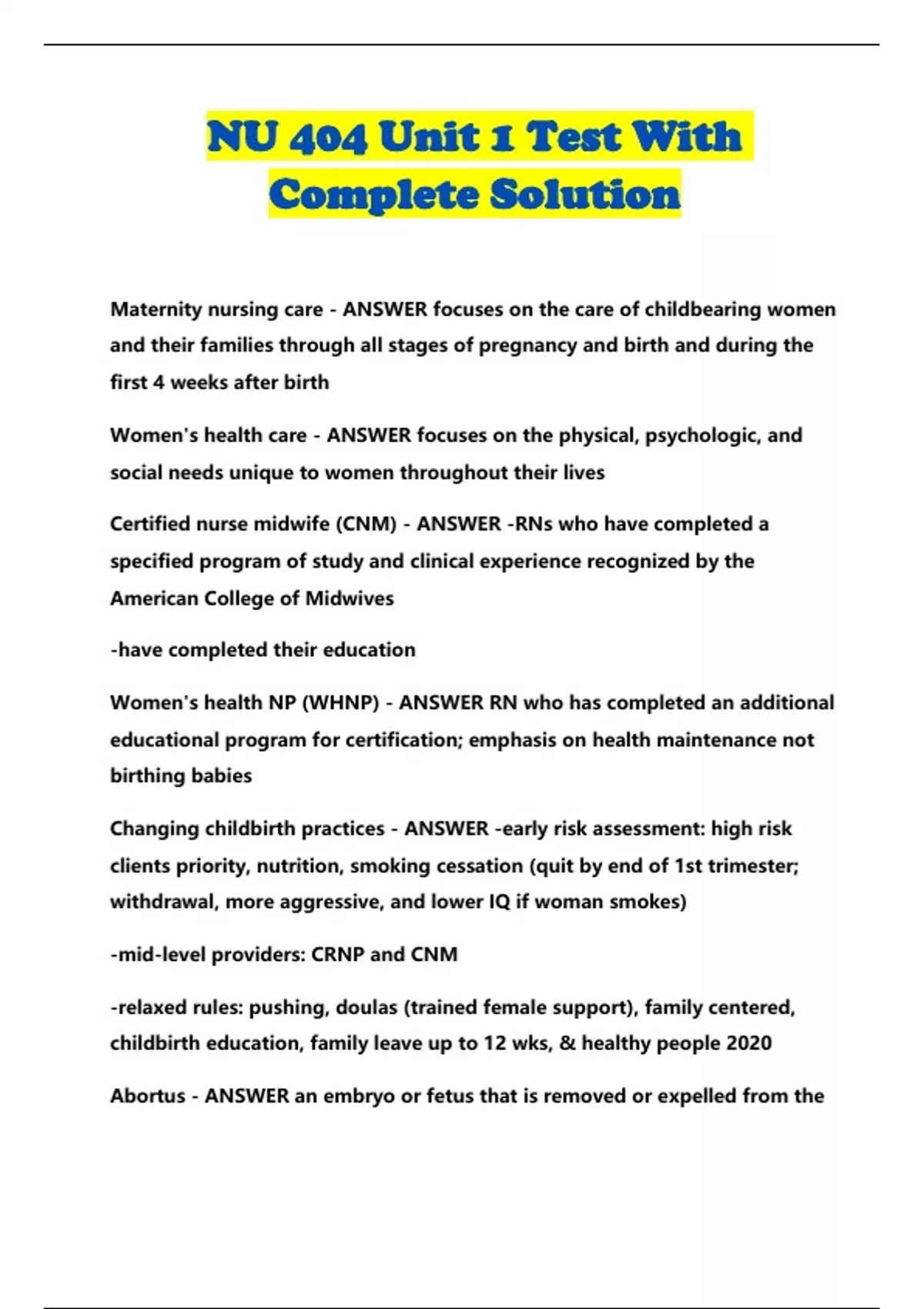 NU 404 Unit 1 Test With Complete Solution