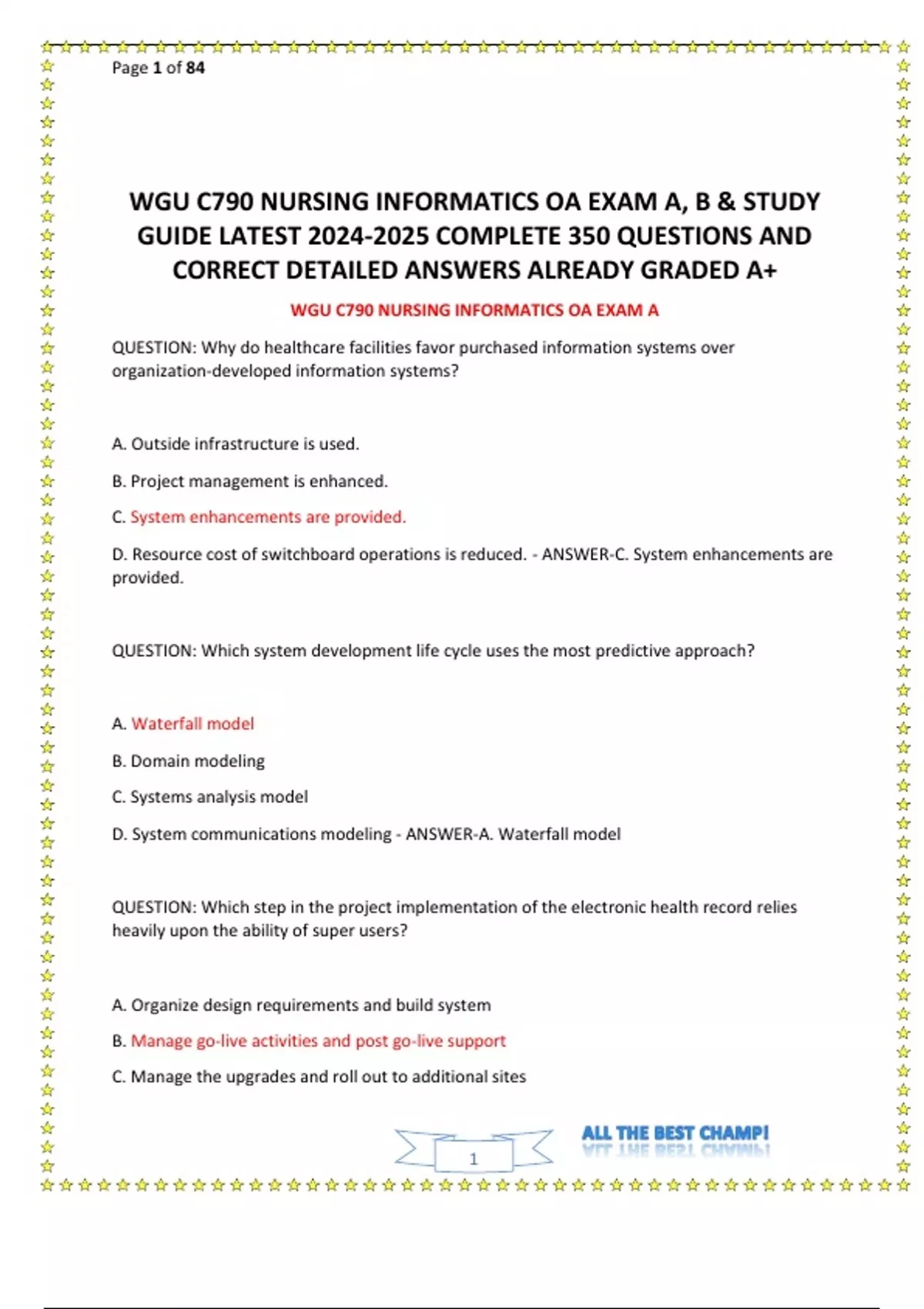 WGU C790 NURSING INFORMATICS OA EXAM A, B & STUDY GUIDE LATEST COMPLETE 350 QUESTIONS AND CORRECT DETAILED ANSWERS ALREADY GRADED A+.