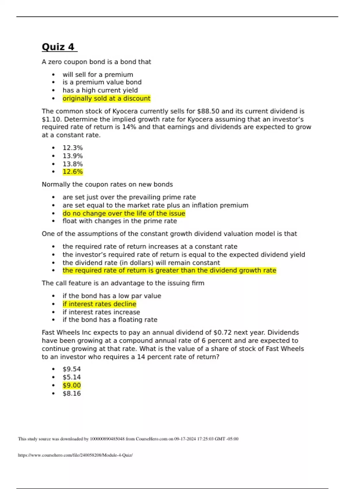 Quiz 4 A zero coupon bond is a bond that  will sell for a premium  is a premium value bond  has a high current yield  originally sold at a discount The common stock of Kyocera currently sells for $88.50 and its current dividend is $1.10. Determine the implied growth rate for Kyocera assuming that an investor’s required rate of return is 14% and that earnings and dividends are expected to grow at a constant rate.  12.3%  13.9%  13.8%  12.6% Normally the coupon rates on new bonds  are set just over the prevailing prime rate  are set equal to the market rate plus an inflation premium  do no change over the life of the issue  float with changes in the prime rate One of the assumptions of the constant growth dividend valuation model is that  the required rate of return increases at a constant rate  the investor’s required rate of return is equal to the expected dividend yield  the dividend rate (in dollars) will remain constant  the required rate of return is greater than the dividend growth rate The call feature is an advantage to the issuing firm  if the bond has a low par value  if interest rates decline  if interest rates increase  if the bond has a floating rate Fast Wheels Inc expects to pay an annual dividend of $0.72 next year. Dividends have been growing at a compound annual rate of 6 percent and are expected to continue growing at that rate. What is the value of a share of stock of Fast Wheels to an investor who requires a 14 percent rate of return?  $9.54  $5.14  $9.00  $8.16 This study source was downloaded by from CourseH on :25:03 GMT -05:00 neither earnings nor dividends are expected to grow in the future. What is the value of Zero-Sum’s stock to an investor requires a 14 percent rate of return?  $10.00  $14.00  0  $20.00 The valuation of common stock is considerably more complicated than the valuation of bonds or preferred stocks because:  Common stock dividends are normally expected to grow and not remain constant  The returns from common stocks are generally larger and more certain than the returns from bonds and preferred stocks  The returns can take two forms. i.e. annual cash payments and price appreciation  The returns can be in annual cash payments or price appreciation, and they are normally expected to grow and not remain constant Which of the following is the highest risk debt issue?  Debenture  Senior debt  Equipment trust certificate  Mortgage bond Two-years ago, Trans-Atlantic Airlines sold a $250 million bond issue to finance the purchase of new jet airliners. These bonds were issued in $1000 denominations with an original maturity of 12 years and a coupon rate of 12%. Determine the value today of one of these bonds to an investor who requires a 14% rate of return on these securities.  $626  $463  $270  $897 A zero coupon bond is an example of a(n) ____  Fixed income security and an original issue deep discount bond  Tax-exempt bond  Fixed income security  Original issue deep discount bond Baywa has an outstanding bond that has a coupon rate of 8.3%. What is the market price of this bond if it pays interest semi-annually, has 15 years to maturity, and the current required rate of return is 9% on bonds of similar quality?  $1,000 $1059  $954  $943 What is the value of the PacTen bond with a 10 percent coupon that matures in 15 years? Assume the current market rate for this bond is 16 percent and that interest is paid semiannually.  $1,000  $661.90  $875.51  $1,227.78 What is the value of a Northern Pacific bond with an 11 percent coupon, maturing in 15 years? Assume the market rate for this bond is 14 percent and that interest is paid semiannually.  $1,000  $853.30  $813.50  $790.74 If the general level of interest rates in the economy moves up, then investors will require a ___ rate of return on securities, and, in general, stock prices should ___, ceteris paribus.  higher, decline  lower, increase  lower, decline  higher, increase The value of a 15-year bond will change ____ for a given change in the required rate of return than the value of a 5 year bond.  exactly the same  less  the same percentage  more If the competition is an industry increases, the future growth potential should  be negative  increase  not to be affected  decrease In the constant-growth dividend valuation model, the required rate of return must be ___ the dividend growth rate in order for the formula price to be meaningful.  equal to  greater than  less than  proportional to The stock of Music City is selling for $37.50 and pays a current annual dividend $1.10. What is the implied growth rate of dividends for this firm (assume dividends are expected to grow at a constant rate) if an investor’s required rate of return is 14 percent?  14.0%  11.07%  11.4%  10.75% The call feature of a long-term bond  is an optional retirement provision  states the call price  allows the issuer to replace a high coupon bond with one with a lower coupon bond  all answers are correct During the past 8 years, UTX Company common stock dividends have grown from $2.70 to $5.00 per share (currently). Determine the value of UTX common stock to an investor who requires a 16% rate of return, assuming that dividends continue growing for the foreseeable future at the same rate as over the past 8 years.  $31.25  $62,50  $67.50  $46.96 Junk bonds are  are issued by firms with a high debt ratio  issued with coupon rates at least 8 percentage points or more above the highest quality issues  usually rated Ba or higher  are issued by firms with a low debt ration What is the value of a share of stock of HOV Inc. to an investor who requires a 12 percent rate of return if HOV’s current dividend is $1.20? Assume earnings and dividends are expected to grow at a comp