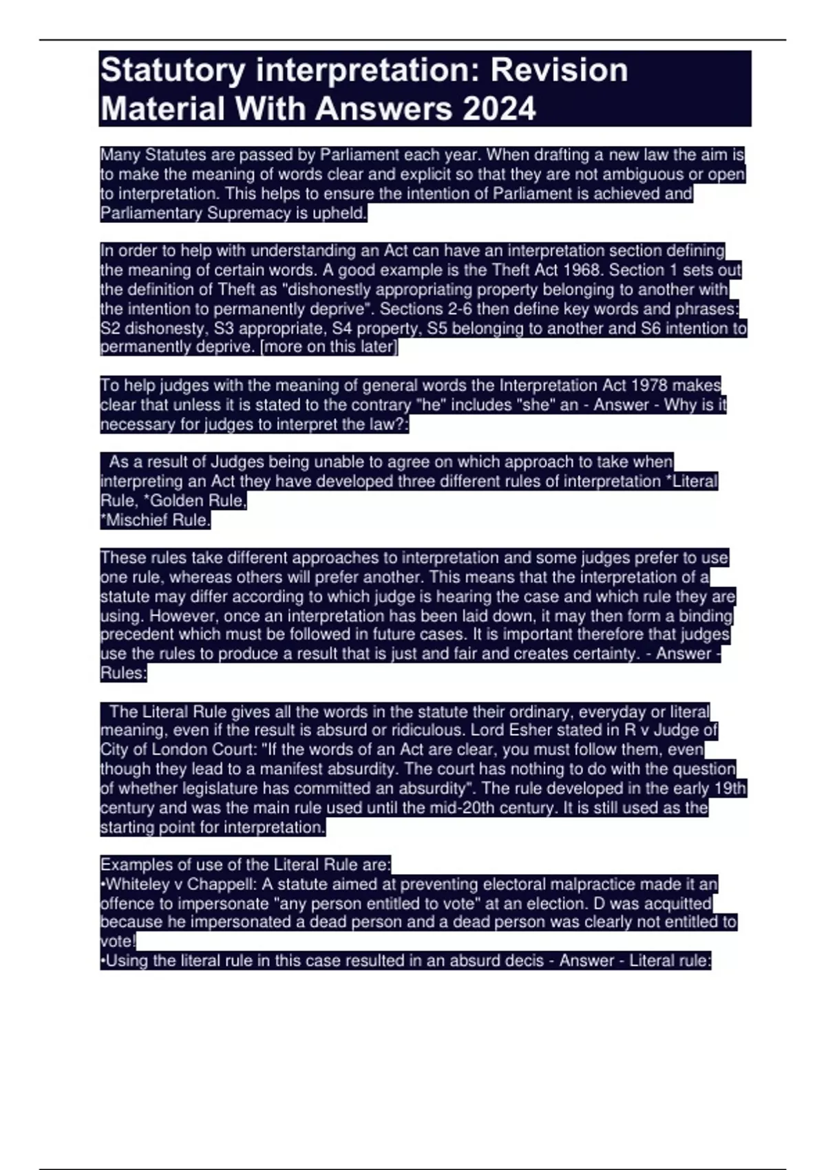 •Using the literal rule in this case resulted in an absurd decis - Answer - Literal rule: