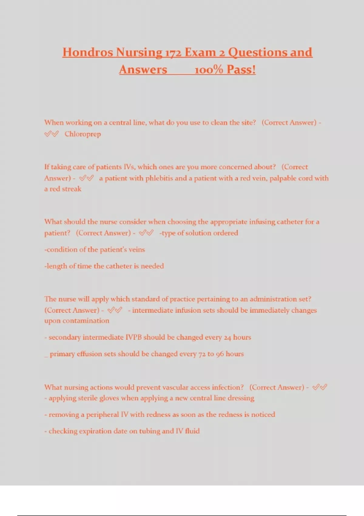 Hondros Nursing 172 Exam 2 Questions and Answers____ 100% Pass! What action would show an understanding by the LPN of a sterile technique? (Correct Answer) - - the LPN only touches sterile objects to other sterile objects - the LPN takes care to make sure that sterile hands do not drop below the waist - the LPN avoids touching outside the one-inch border of the sterile field The patient has just had a hip fracture and has a history of CHF; which of these are risk for complications associated with the patients IV site? (Correct Answer) - - immunity to infection generally declines with age placing Mrs. Livingston at a high-risk for infection - Mrs. Livingston is at an increased risk for infiltration or extravasation injury because geriatric patients typically have more fragile veins - have a fragile vein and being an elderly patient increase Mrs. Livingstons risk for phlebitis