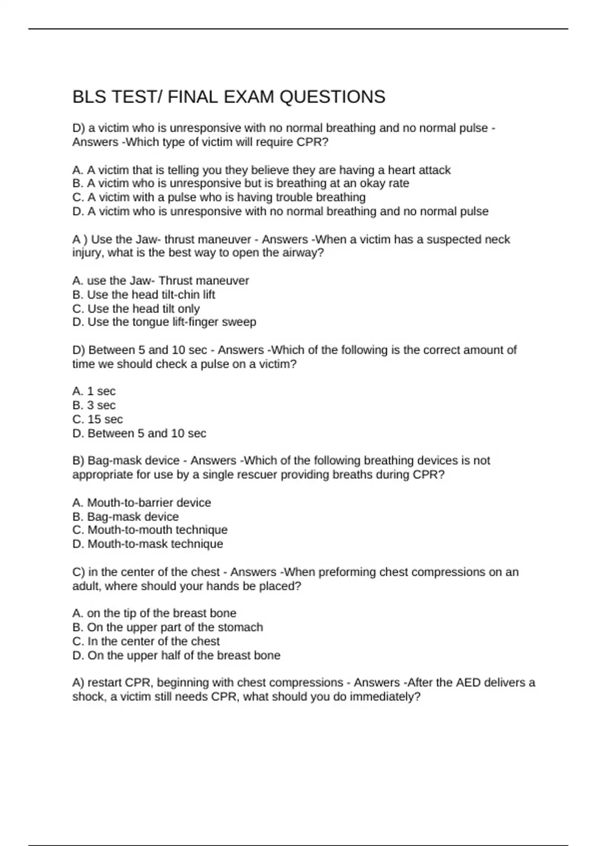 BLS TEST/ FINAL EXAM QUESTIONS