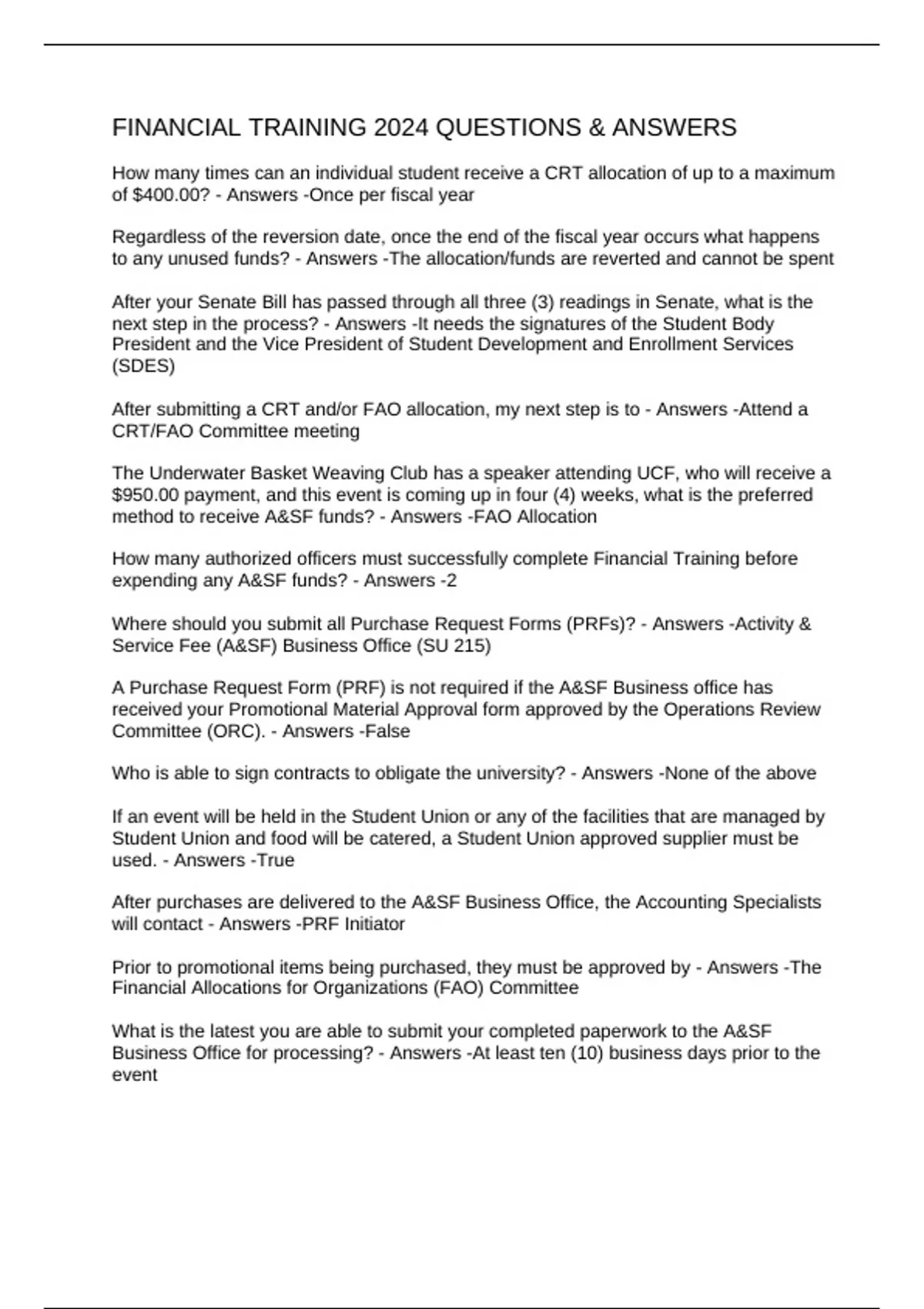 FINANCIAL TRAINING 2024 QUESTIONS & ANSWERS