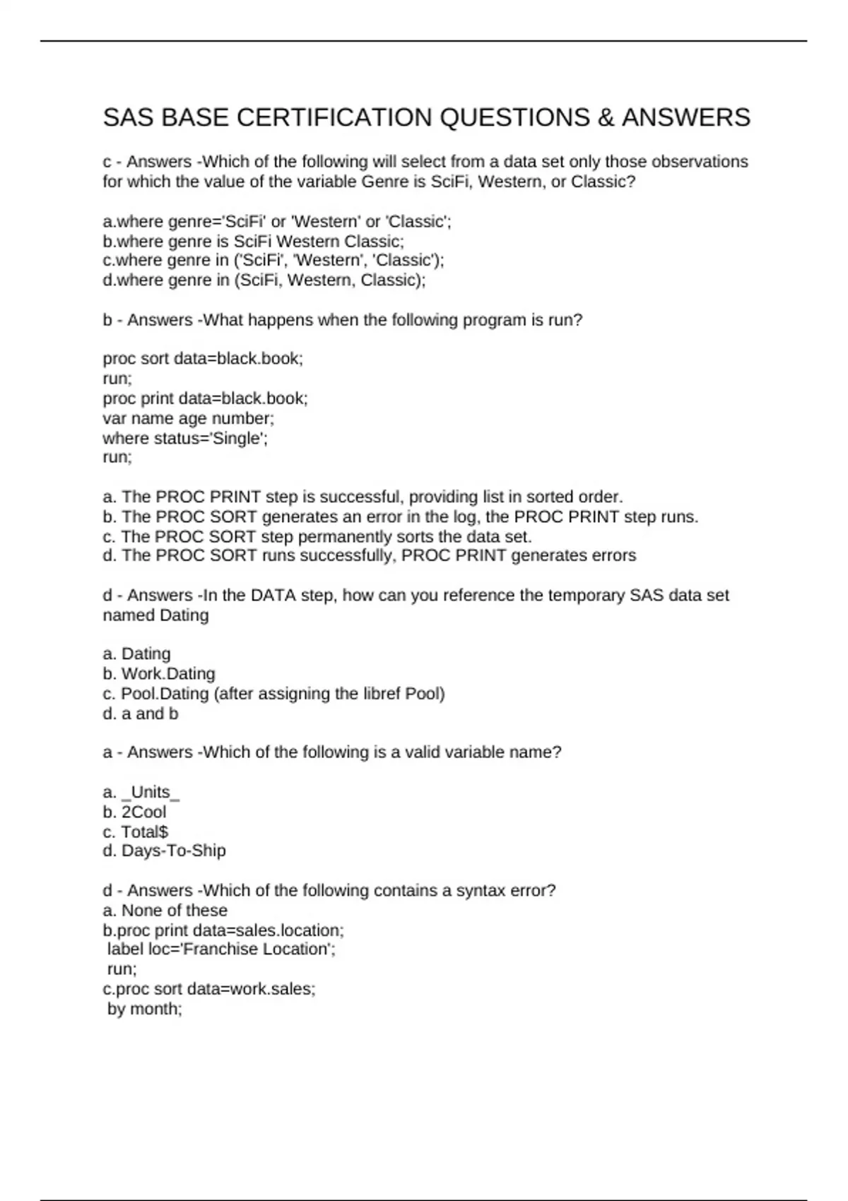 SAS BASE CERTIFICATION QUESTIONS & ANSWERS