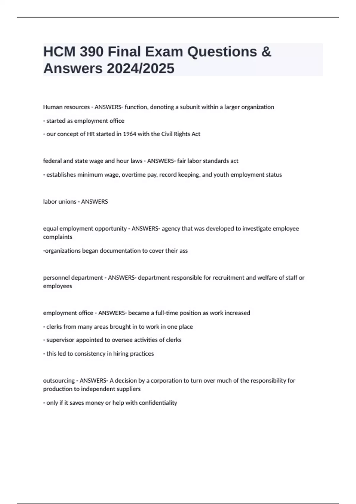 HCM 390 Final Exam Questions & Answers 2024/2025 Human resources - ANSWERS- function, denoting a subunit within a larger organization - started as employment office - our concept of HR started in 1964 with the Civil Rights Act federal and state wage and hour laws - ANSWERS- fair labor standards act - establishes minimum wage, overtime pay, record keeping, and youth employment status labor unions - ANSWERS equal employment opportunity - ANSWERS- agency that was developed to investigate employee complaints -organizations began documentation to cover their ass personnel department - ANSWERS- department responsible for recruitment and welfare of staff or employees employment office - ANSWERS- became a full-time position as work increased - clerks from many areas brought in to work in one place - supervisor appointed to oversee activities of clerks - this led to consistency in hiring practices outsourcing - ANSWERS- A decision by a corporation to turn over much of the responsibility for production to independent suppliers - only if it saves money or help with confidentiality