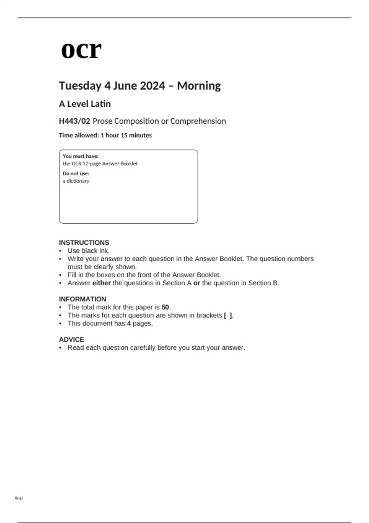 ocr A Level Latin (H443-02) Question Paper June2024.