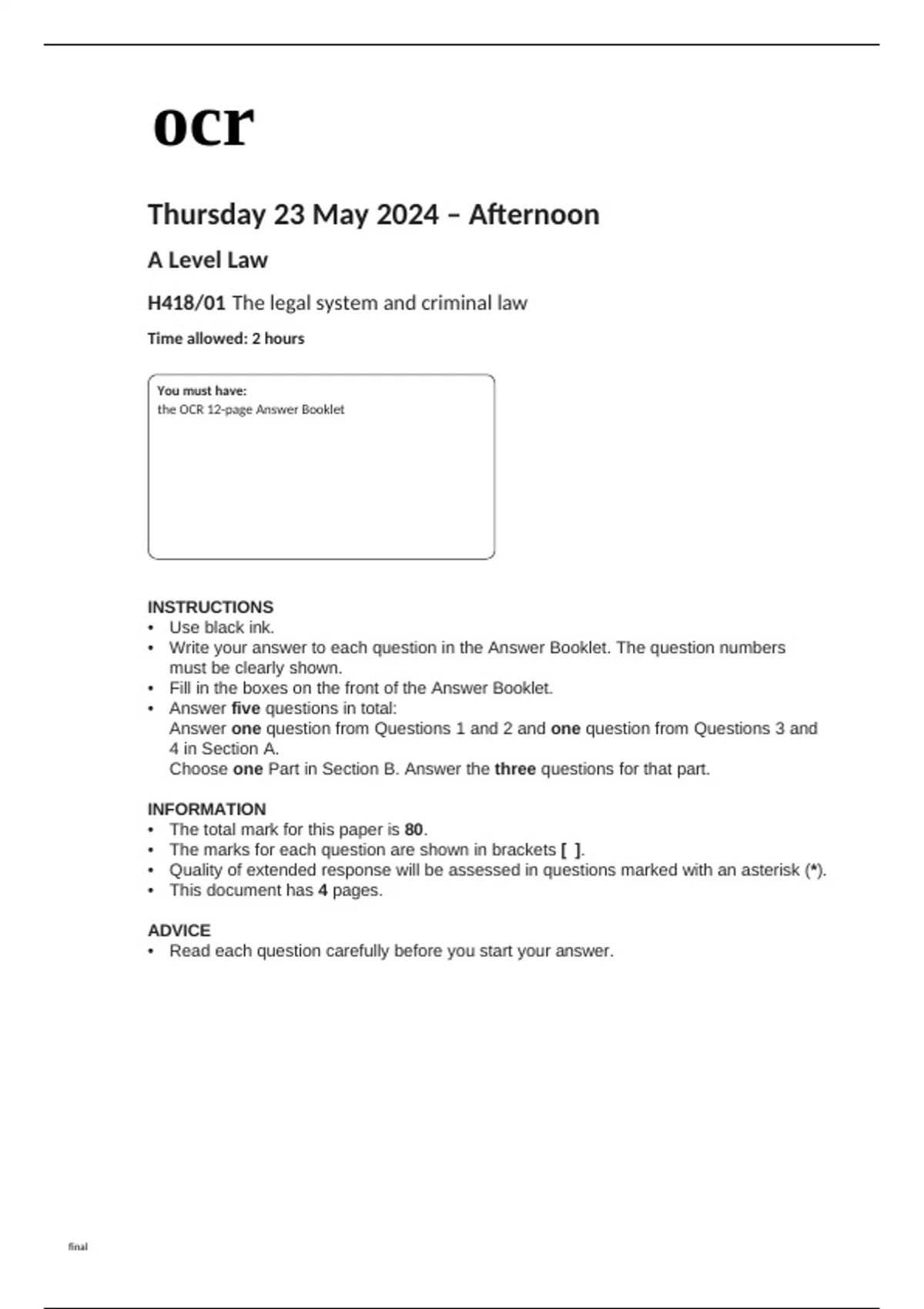 ocr A Level Law (H418-01) Question Paper May2024.