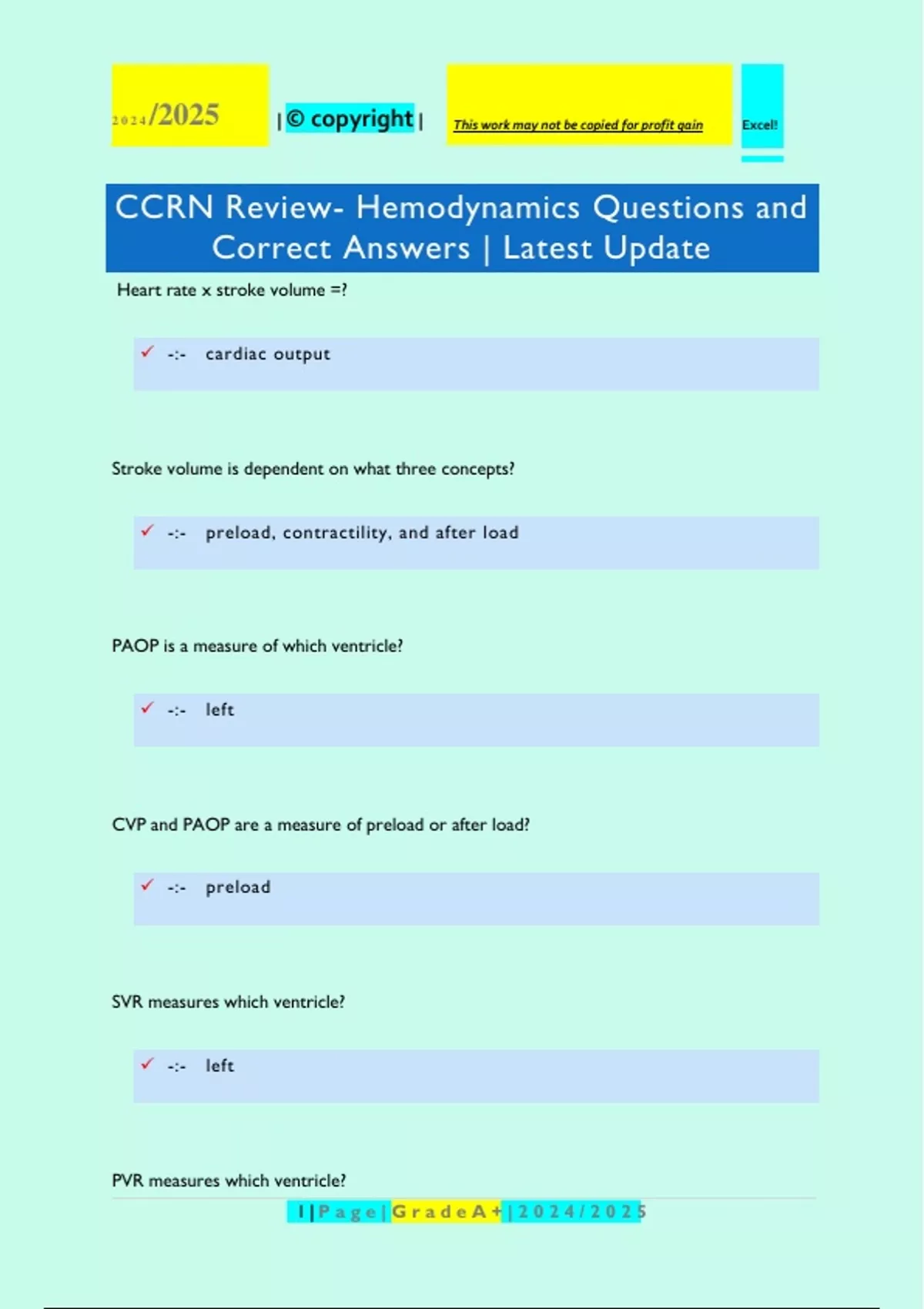 Heart rate x stroke volume =? -:- cardiac output Stroke volume is dependent on what three concepts? -:- preload, contractility, and after load PAOP is a measure of which ventricle? -:- left CVP and PAOP are a measure of preload or after load? -:- preload SVR measures which ventricle? -:- left PVR measures which ventricle? 2 | P a g e | G r a d e A + | 2 0 2 4 / 2 0 2 5 Excel! 2 0 2 4 /2025 | © copyright | This work may not be copied for profit gain -:- right PVR and SVR are a measure of preload or after load? -:- afterload What is a normal cardiac output? -:- 4-8 L/min What is a normal cardiac index? -:- 2.5-4L/min/m2 If cardiac output becomes critically low, what will happen to BP? -:- it will decrease Bradycardia results in high or low cardiac output? -:- low 3 | P a g e | G r a d e A + | 2 0 2 4 / 2 0 2 5 Excel! 2 0 2 4 /2025 | © copyright | This work may not be copied for profit gain What is the first sign of compensation for a low cardiac output