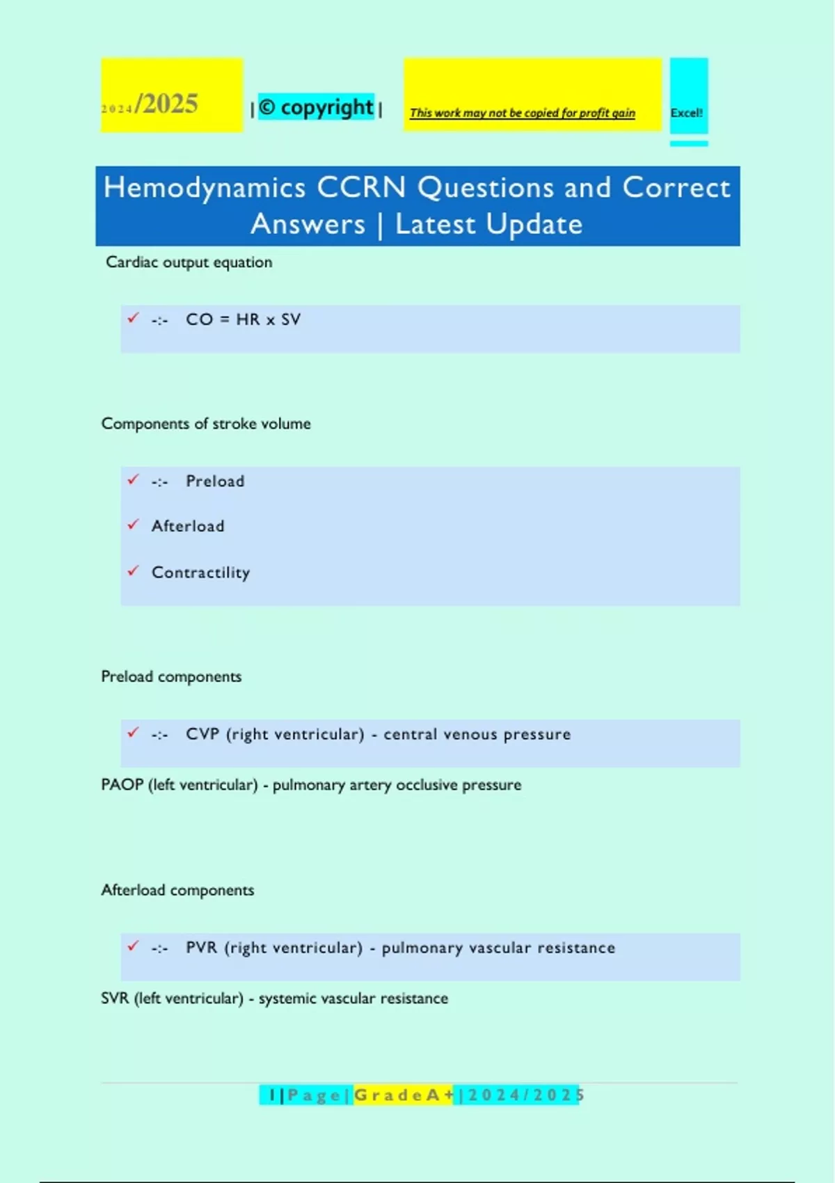 Hemodynamics CCRN Questions and Correct