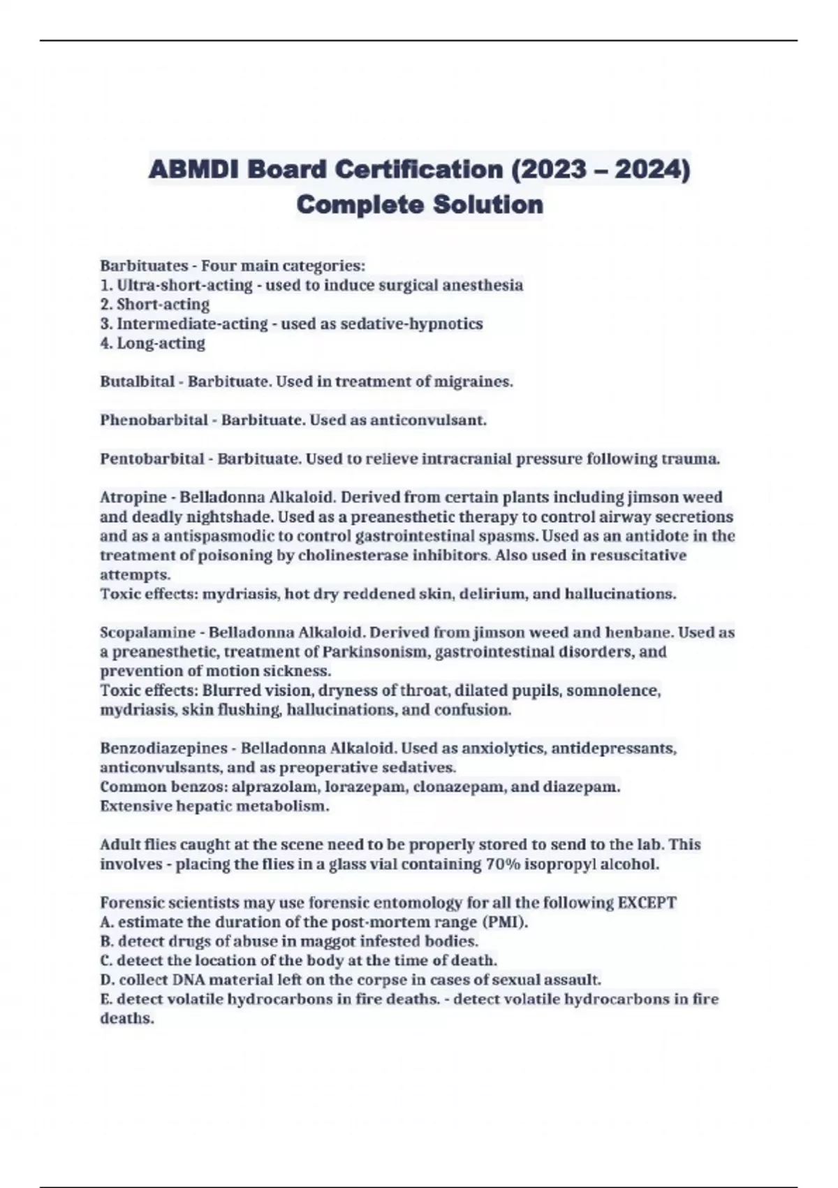 Barbituates - Four main categories: I. Ultra-short-acting - used to induce surgical anesthesia 2. Short-acting 3. Intermediate-acting - used as sedative-hypnotics 4. Long-acting Butalbital - Barbituate. Used in treatment of migraines. Phenobarbital - Barbituate. Used as anticonvulsant. Pentobarbital - Barbituate. Used to relieve intracranial pressure following trauma. Atropine - Belladonna Alkaloid. Derived from certain plants including jimson weed and deadly nightshade. Used as a preanesthetic therapy to control airway secretions and as a antispasmodic to control gastrointestinal spasms. Used as an antidote in the treatment of poisoning by cholinesterase inhibitors. Also used in resuscitative attempts. Toxic effects: mydriasis, hot dry reddened skin, delirium, and hallucinations. Scopalamine - Belladonna Alkaloid. Derived from jimson weed and henbane. Used as a preanesthetic, treatment of Parkinsonism, gastrointestinal disorders, and prevention of motion sickness. Toxic effects: Blurred vision, dryness of throat, dilated pupils, somnolence, mydriasis, skin flushing, hallucinations, and confusion. Benzodiazepines - Belladonna Alkaloid. Used as anxiolytics, antidepressants, anticonvulsants, and as preoperative sedatives. Common benzos: alprazolam, lorazepam, clonazepam, and diazepam. Extensive hepatic metabolism. Adult flies caught at the scene need to be properly stored to send to the lab. This involves - placing the flies in a glass vial containing 70% isopropyl alcohol. Forensic scientists may use forensic entomology for all the following EXCEPT A. estimate the duration of the post-mortem range (PMI). B. detect drugs of abuse in maggot infested bodies. C. detect the location of the body at the time of death. D. collect DNA material left on the corpse in cases of sexual assault. E. detect volatile hydrocarbons in fire deaths. - detect volatile hydrocarbons in fire deaths.