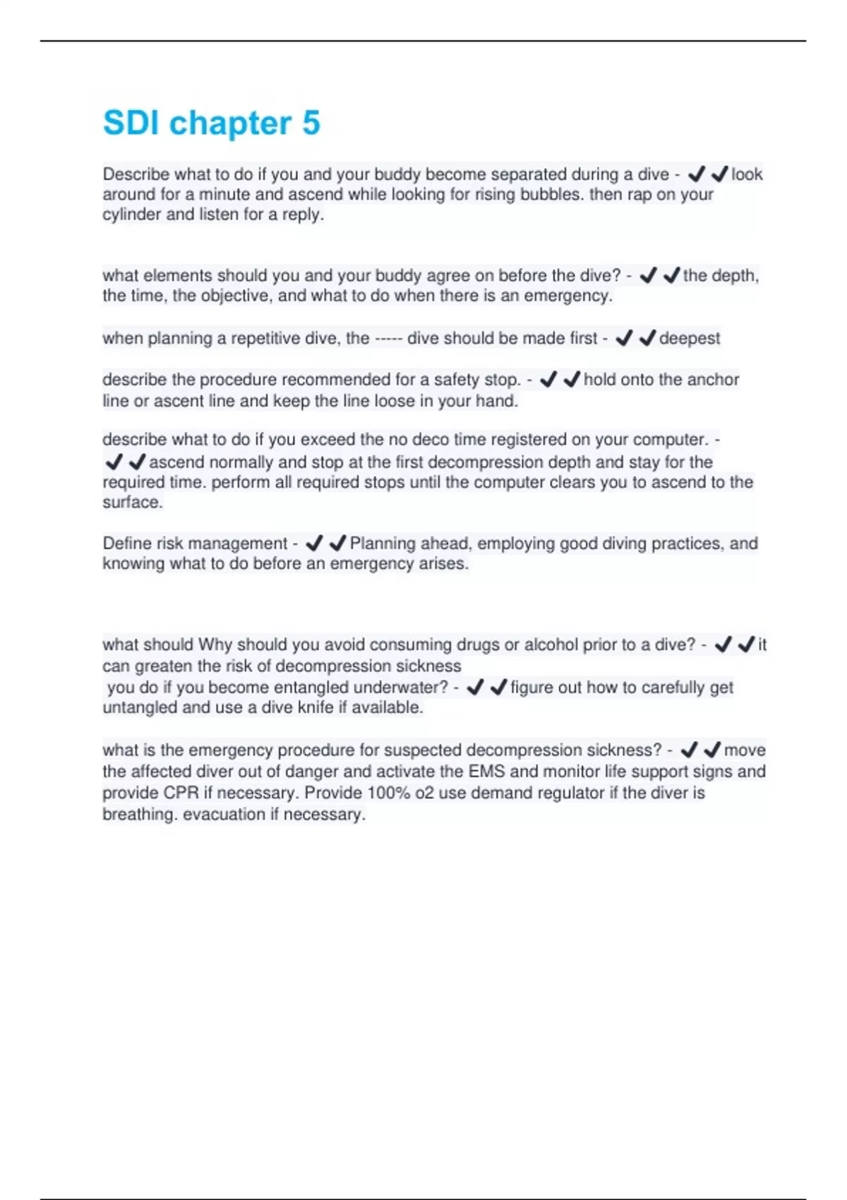 Describe what to do if you and your buddy become separated during a dive - ️️look around for a minute and ascend while looking for rising bubbles. then rap on your cylinder and listen for a reply. what elements should you and your buddy agree on before the dive? - ️️the depth, the time, the objective, and what to do when there is an emergency. when planning a repetitive dive, the ----- dive should be made first - ️️deepest describe the procedure recommended for a safety stop. - ️️hold onto the anchor line or ascent line and keep the line loose in your hand. describe what to do if you exceed the no deco time registered on your computer. - ️️ascend normally and stop at the first decompression depth and stay for the required time. perform all required stops until the computer clears you to ascend to the surface. Define risk management - ️️Planning ahead, employing good diving practices, and knowing what to do before an emergency arises. what should Why should you avoid consuming drugs or alcohol prior to a dive? - ️️it can greaten the risk of decompression sickness you do if you become entangled underwater? - ️️figure out how to carefully get untangled and use a dive knife if available. what is the emergency procedure for suspected decompression sickness? - ️️move the affected diver out of danger and activate the EMS and monitor life support signs and provide CPR if necessary. Provide 100% o2 use demand regulator if the diver is breathing. evacuation if necessary.