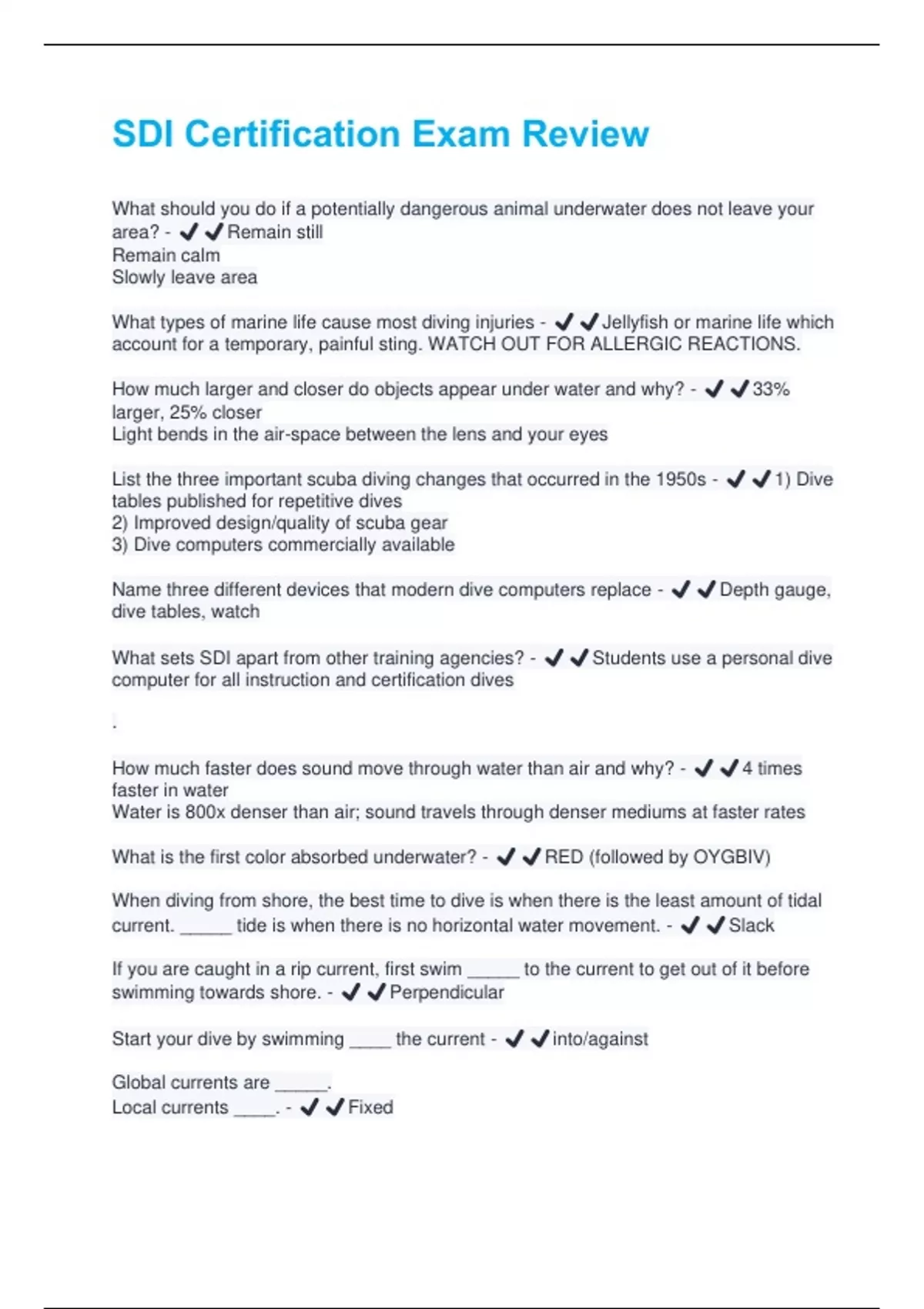 What should you do if a potentially dangerous animal underwater does not leave your area? - ️️Remain still Remain calm Slowly leave area What types of marine life cause most diving injuries - ️️Jellyfish or marine life which account for a temporary, painful sting. WATCH OUT FOR ALLERGIC REACTIONS. How much larger and closer do objects appear under water and why? - ️️33% larger, 25% closer Light bends in the air-space between the lens and your eyes List the three important scuba diving changes that occurred in the 1950s - ️️1) Dive tables published for repetitive dives 2) Improved design/quality of scuba gear 3) Dive computers commercially available Name three different devices that modern dive computers replace - ️️Depth gauge, dive tables, watch What sets SDI apart from other training agencies? - ️️Students use a personal dive computer for all instruction and certification dives . How much faster does sound move through water than air and why? - ️️4 times faster in water Water is 800x denser than air; sound travels through denser mediums at faster rates What is the first color absorbed underwater? - ️️RED (followed by OYGBIV) When diving from shore, the best time to dive is when there is the least amount of tidal current. _____ tide is when there is no horizontal water movement. - ️️Slack If you are caught in a rip current, first swim _____ to the current to get out of it before swimming towards shore. - ️️Perpendicular Start your dive by swimming ____ the current - ️️into/against Global currents are _____. Local currents ____. - ️️FixedFluctuate Rip current - ️️Current which goes seaward due to ocean floor stuctures Long shore current - ️️Flows parallel to shore Waves are caused by - ️️energy generated by WIND Tides are caused by - ️️polarity of the moon