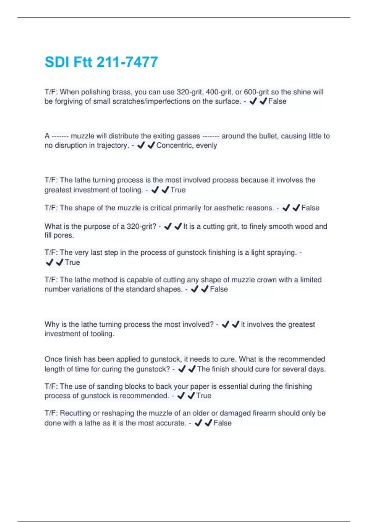 T/F: When polishing brass, you can use 320-grit, 400-grit, or 600-grit so the shine will be forgiving of small scratches/imperfections on the surface. - ️️False A ------- muzzle will distribute the exiting gasses ------- around the bullet, causing little to no disruption in trajectory. - ️️Concentric, evenly T/F: The lathe turning process is the most involved process because it involves the greatest investment of tooling. - ️️True T/F: The shape of the muzzle is critical primarily for aesthetic reasons. - ️️False What is the purpose of a 320-grit? - ️️It is a cutting grit, to finely smooth wood and fill pores. T/F: The very last step in the process of gunstock finishing is a light spraying. - ️️True T/F: The lathe method is capable of cutting any shape of muzzle crown with a limited number variations of the standard shapes. - ️️False Why is the lathe turning process the most involved? - ️️It involves the greatest investment of tooling. Once finish has been applied to gunstock, it needs to cure. What is the recommended length of time for curing the gunstock? - ️️The finish should cure for several days. T/F: The use of sanding blocks to back your paper is essential during the finishing process of gunstock is recommended. - ️️True T/F: Recutting or reshaping the muzzle of an older or damaged firearm should only be done with a lathe as it is the most accurate. - ️️FalseHow long should stain sit, at a minimum, before you apply the finish? - ️️It should sit overnight at a minimum. What is the primary downside of using the lathe turning process? - ️️The initial investment. The most popular muzzle shapes are: - ️️Flat, round, and 11 degree.