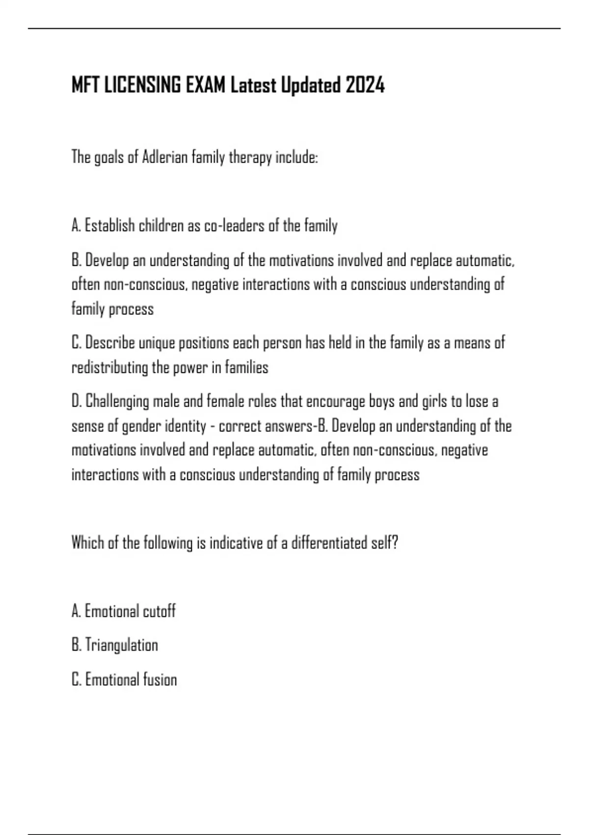 MFT LICENSING EXAM Latest Updated 2024 The goals of Adlerian family therapy include: A. Establish children as co-leaders of the family B. Develop an understanding of the motivations involved and replace automatic, often non-conscious, negative interactions with a conscious understanding of family process C. Describe unique positions each person has held in the family as a means of redistributing the power in families D. Challenging male and female roles that encourage boys and girls to lose a sense of gender identity - correct answers-B. Develop an understanding of the motivations involved and replace automatic, often non-conscious, negative interactions with a conscious understanding of family process Which of the following is indicative of a differentiated self? A. Emotional cutoff B. Triangulation C. Emotional fusion D. Rational thought instead of emotional reactivity - correct answers-D. Rational thought instead of emotional reactivity A test of differentiation is: A. Seeing the good in even difficult or emotionally damaging people B. Returning to previous ways of being when one goes home and allowing parents to re-assert attachment activities even with grown adults C. Being able to join family gatherings as an observer who does not get drawn into other family members' patterns of interaction and emotional processing D. All of the above - correct answers-C. Being able to join family gatherings as an observer who does not get drawn into other family members' patterns of interaction and emotional processing