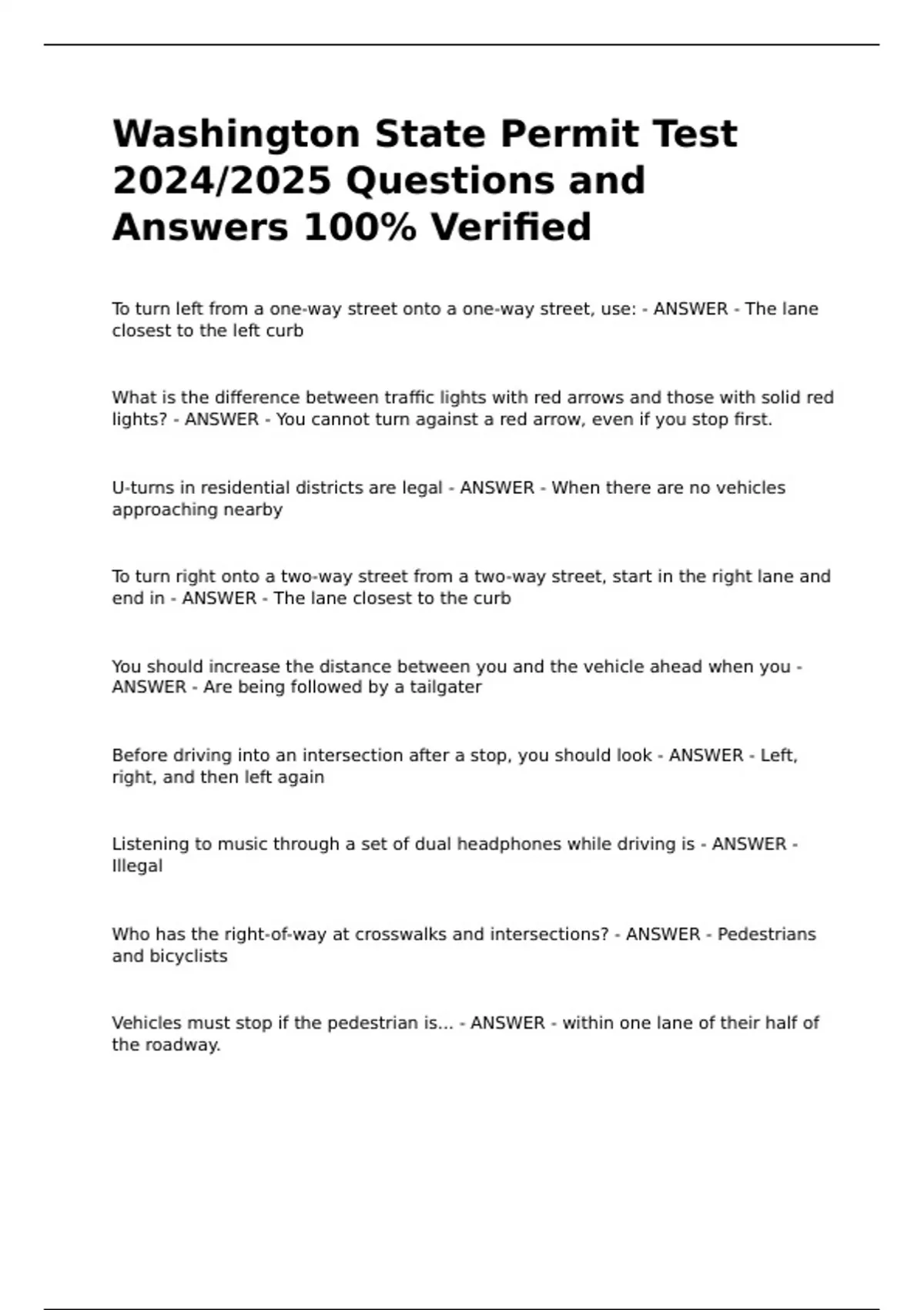 Washington State Permit Test 2024/2025 Questions and Answers 100% VerifiedWashington State Permit Test 2024/2025 Questions and Answers 100% VerifiedWashington State Permit Test 2024/2025 Questions and Answers 100% VerifiedWashington State Permit Test 2024/2025 Questions and Answers 100% VerifiedTo turn left from a one-way street onto a one-way street, use: - ANSWER - The lane closest to the left curb What is the difference between traffic lights with red arrows and those with solid red lights? - ANSWER - You cannot turn against a red arrow, even if you stop first. U-turns in residential districts are legal - ANSWER - When there are no vehicles approaching nearby