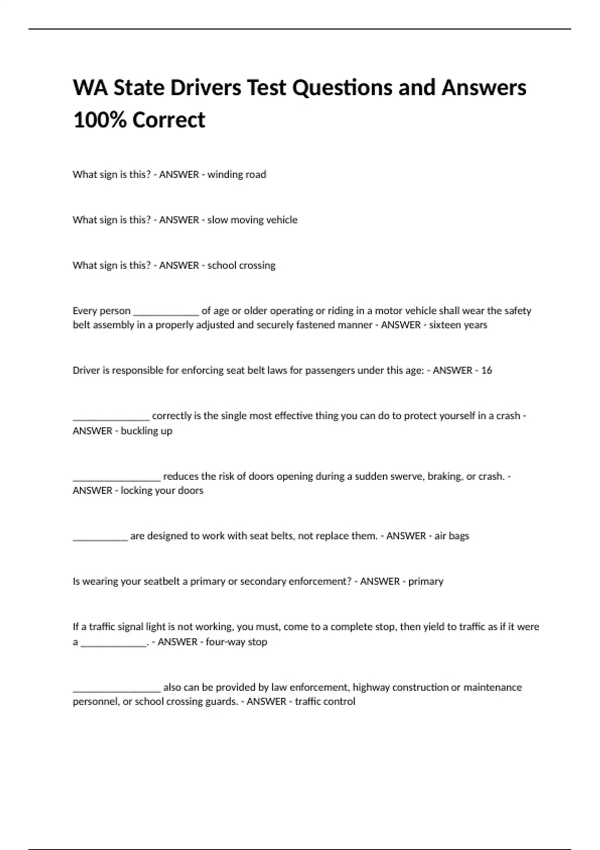 WA State Drivers Test Questions and Answers 100% CorrectWA State Drivers Test Questions and Answers 100% CorrectWA State Drivers Test Questions and Answers 100% CorrectWA State Drivers Test Questions and Answers 100% CorrectWA State Drivers Test Questions and Answers 100% Correct What sign is this? - ANSWER - winding road What sign is this? - ANSWER - slow moving vehicle What sign is this? - ANSWER - school crossing Every person ____________ of age or older operating or riding in a motor vehicle shall wear the safety belt assembly in a properly adjusted and securely fastened manner - ANSWER - sixteen years