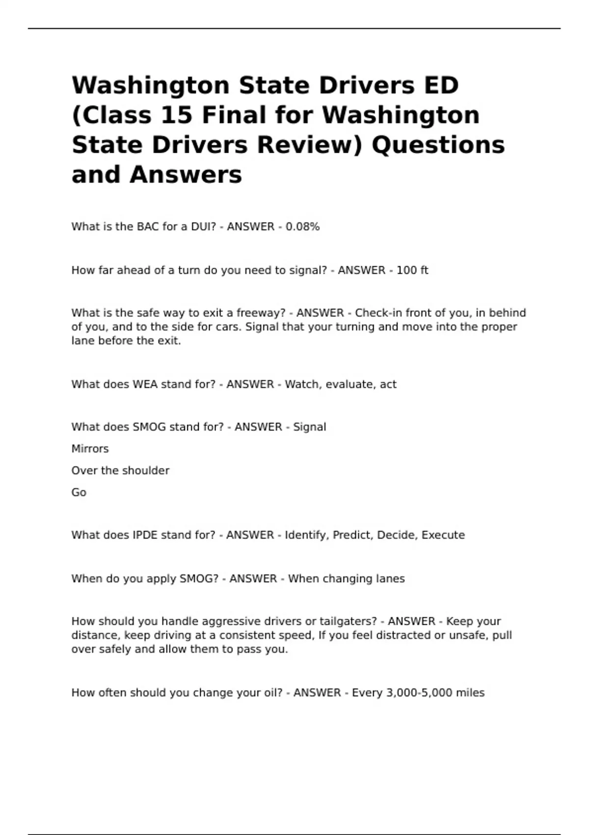 Washington State Drivers ED (Class 15 Final for Washington State Drivers Review) Questions and Answers