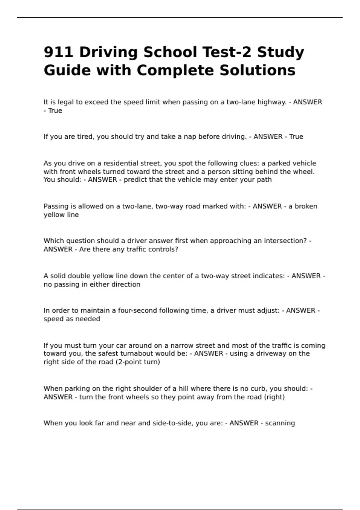 911 Driving School Test-2 Study Guide with Complete Solutions911 Driving School Test-2 Study Guide with Complete Solutions911 Driving School Test-2 Study Guide with Complete Solutions911 Driving School Test-2 Study Guide with Complete Solutions It is legal to exceed the speed limit when passing on a two-lane highway. - ANSWER - True If you are tired, you should try and take a nap before driving. - ANSWER - True As you drive on a residential street, you spot the following clues: a parked vehicle with front wheels turned toward the street and a person sitting behind the wheel. You should: - ANSWER - predict that the vehicle may enter your path