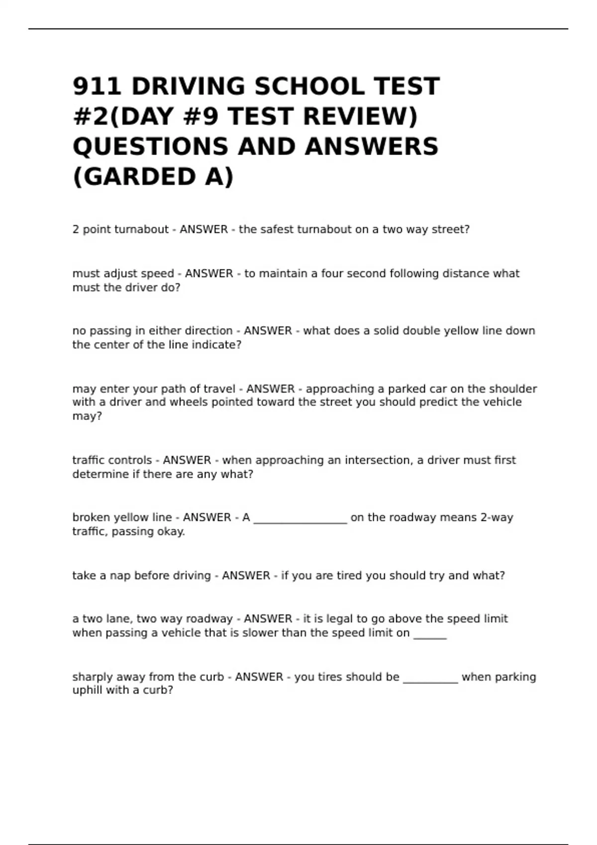 911 DRIVING SCHOOL TEST #2(DAY #9 TEST REVIEW) QUESTIONS AND ANSWERS (GARDED A)911 DRIVING SCHOOL TEST #2(DAY #9 TEST REVIEW) QUESTIONS AND ANSWERS (GARDED A)911 DRIVING SCHOOL TEST #2(DAY #9 TEST REVIEW) QUESTIONS AND ANSWERS (GARDED A) 2 point turnabout - ANSWER - the safest turnabout on a two way street? must adjust speed - ANSWER - to maintain a four second following distance what must the driver do? no passing in either direction - ANSWER - what does a solid double yellow line down the center of the line indicate?