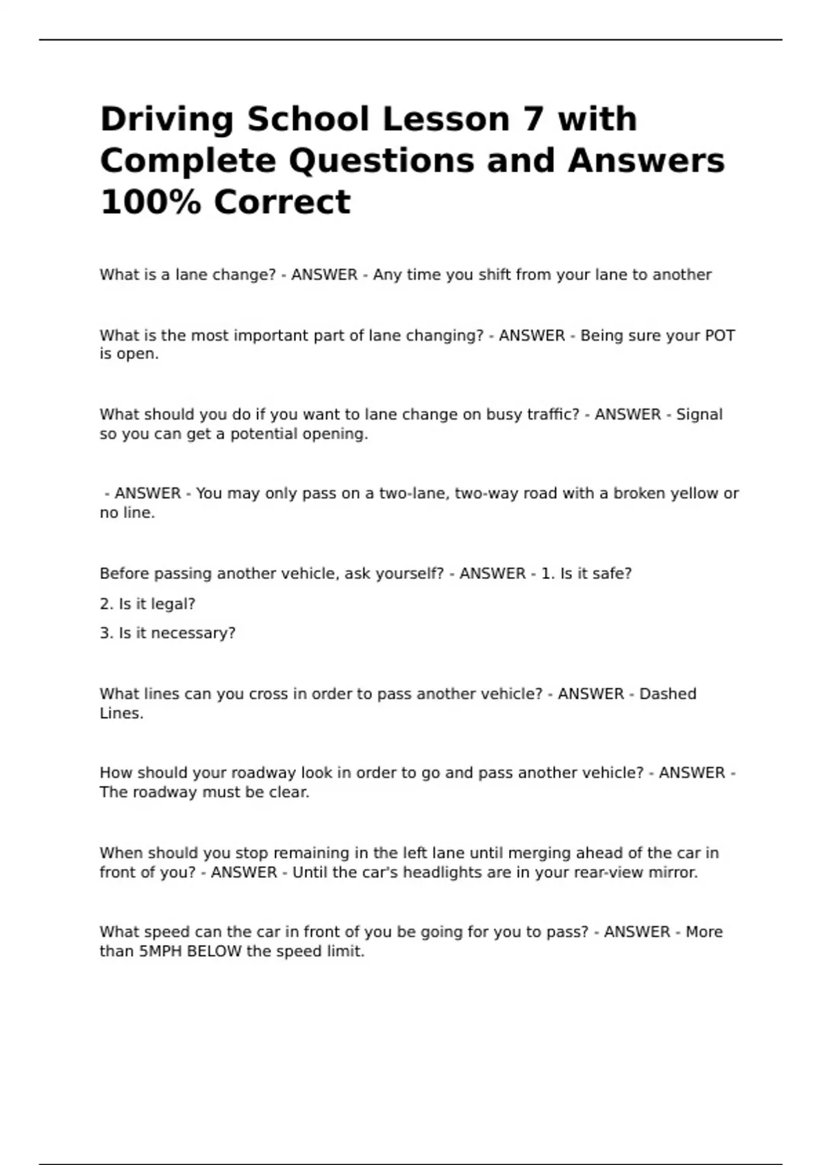 Driving School Lesson 7 with Complete Questions and Answers 100% CorrectDriving School Lesson 7 with Complete Questions and Answers 100% CorrectDriving School Lesson 7 with Complete Questions and Answers 100% CorrectDriving School Lesson 7 with Complete Questions and Answers 100% Correct What is a lane change? - ANSWER - Any time you shift from your lane to another What is the most important part of lane changing? - ANSWER - Being sure your POT is open. What should you do if you want to lane change on busy traffic? - ANSWER - Signal so you can get a potential opening.
